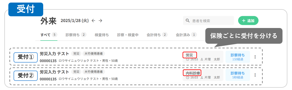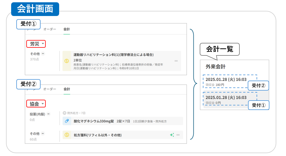 受付を分ける →保険ごとに会計が分けられる為、請求書・明細書もそれぞれ出力されます。