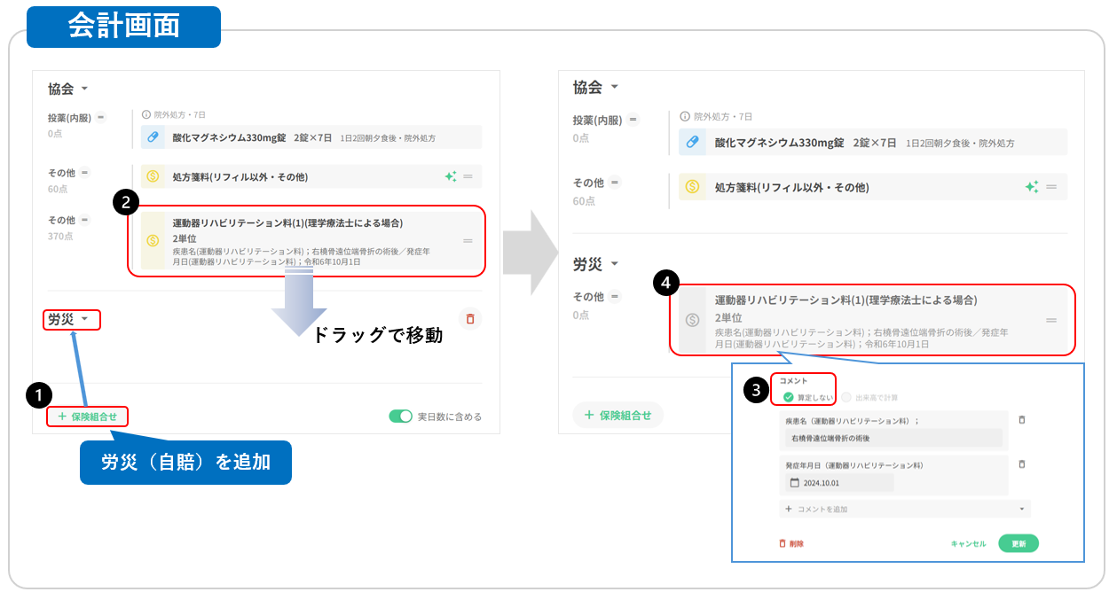+保険組合せを選択し、該当の保険を追加します(画像だと労災) ②該当の算定項目をドラッグして労災(または自賠)に移動させます ③労災(または自賠)の算定項目をクリックし、「算定しない」を選択します ④設定した算定項目がグレー表示されます