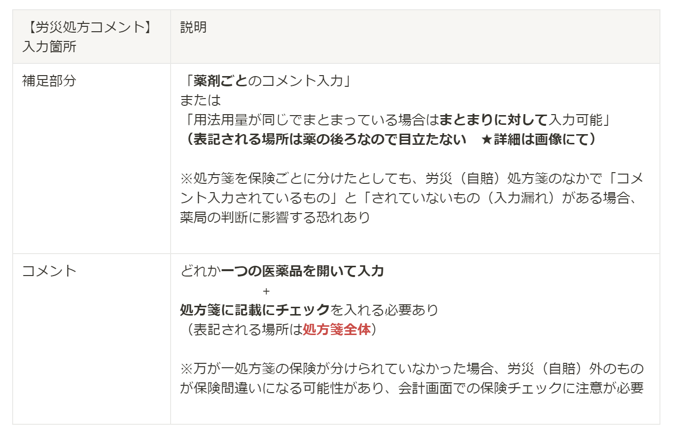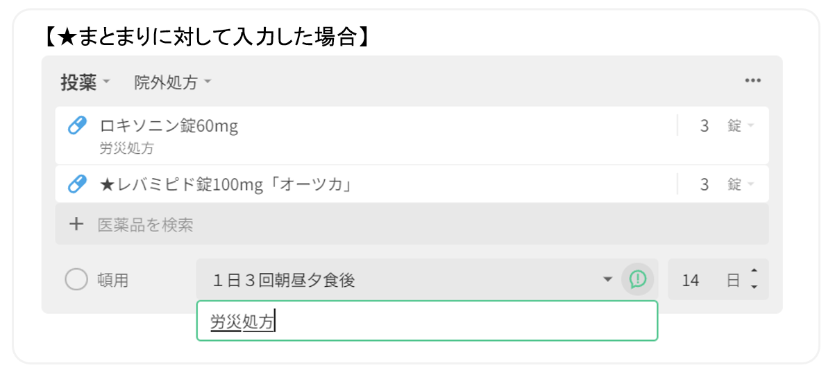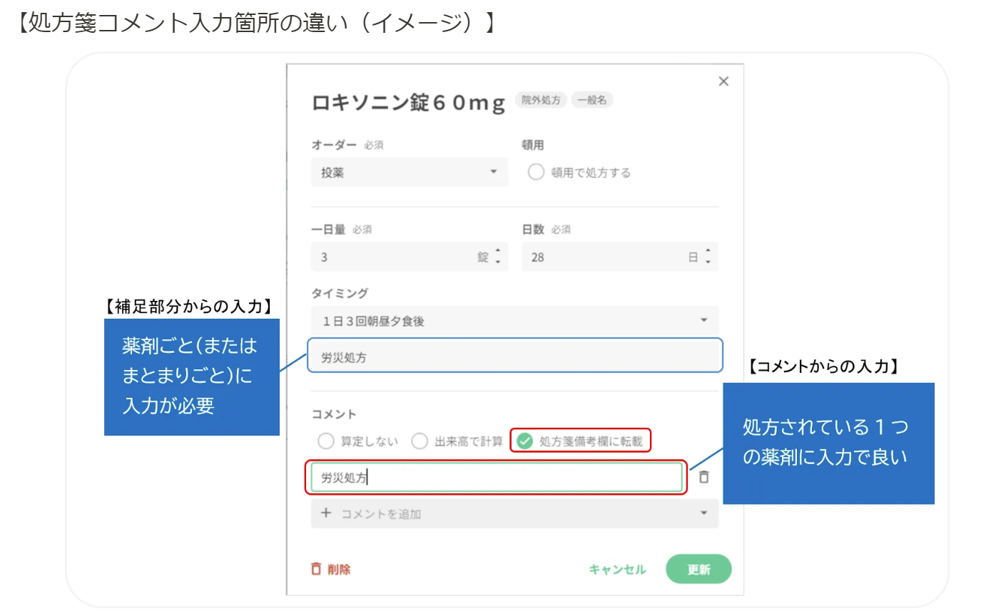 院外薬局へ「労災(自賠)」であること判断頂くためにも、処方コメントを入力頂くことを推奨しております。