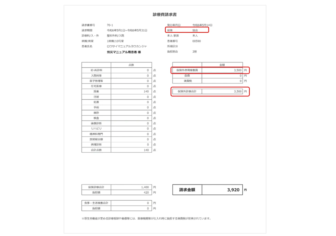 【請求書出力例】 ※画像は診断書代:3500円を請求する場合の表示となっております。