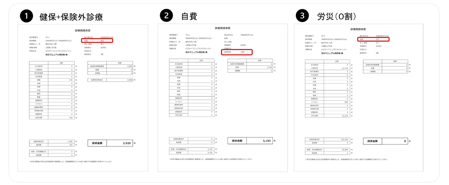 健保→労災の順で出力されます。健保請求書に保険外診療の金額が載ってくるので、そちらを利用してください。(労災は使用しなければ破棄をお願いします。)