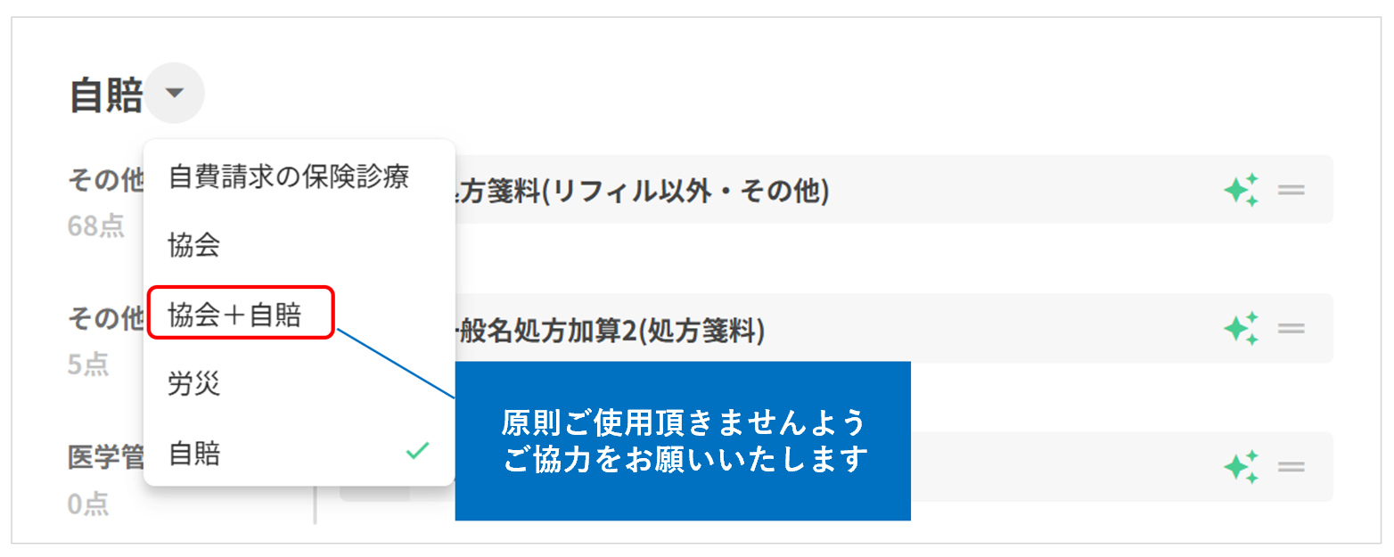 労災(もしくは自賠)の内容を「算定しない」に設定する ※上記の場合、労災(もしくは自賠)請求時に請求漏れがないようご注意ください ①