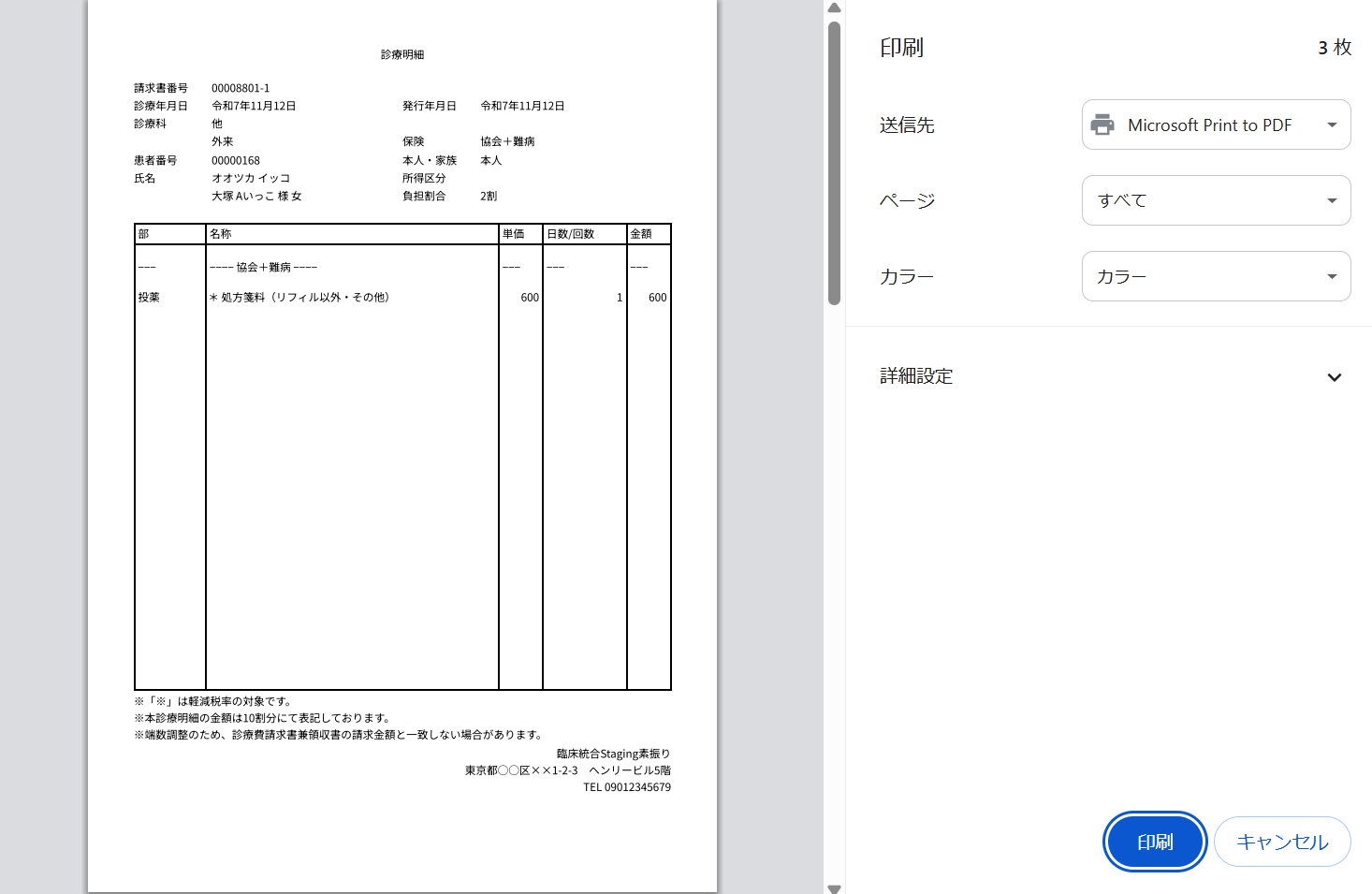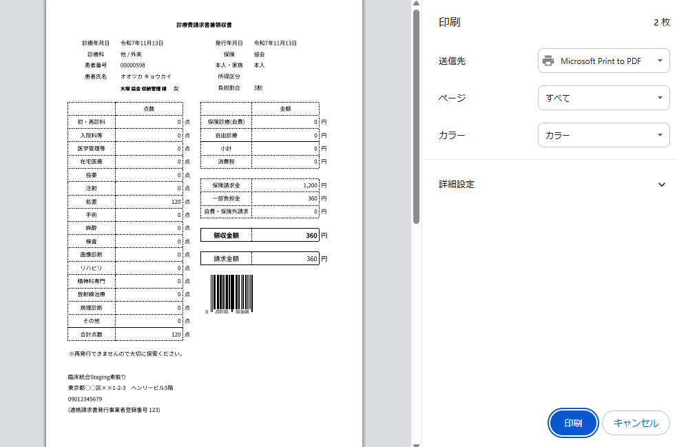 「確定して請求」を選択すると新しく追加した「請求・領収」画面が開いた後にブラウザの印刷プレビューを表示します