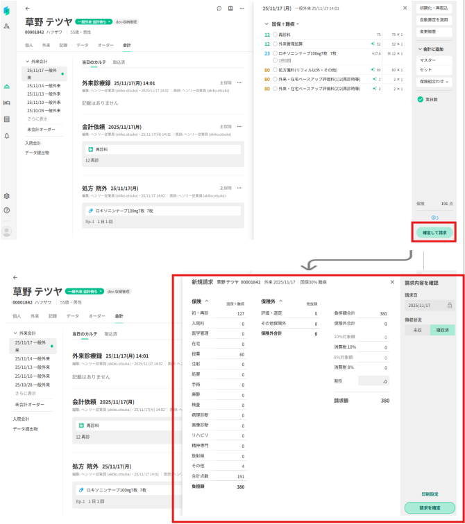 「請求・領収」画面と会計・診療録の画面を並べて内容が確認できるようになるため、請求内容や保険・公費適用の間違いに気づきやすくなります