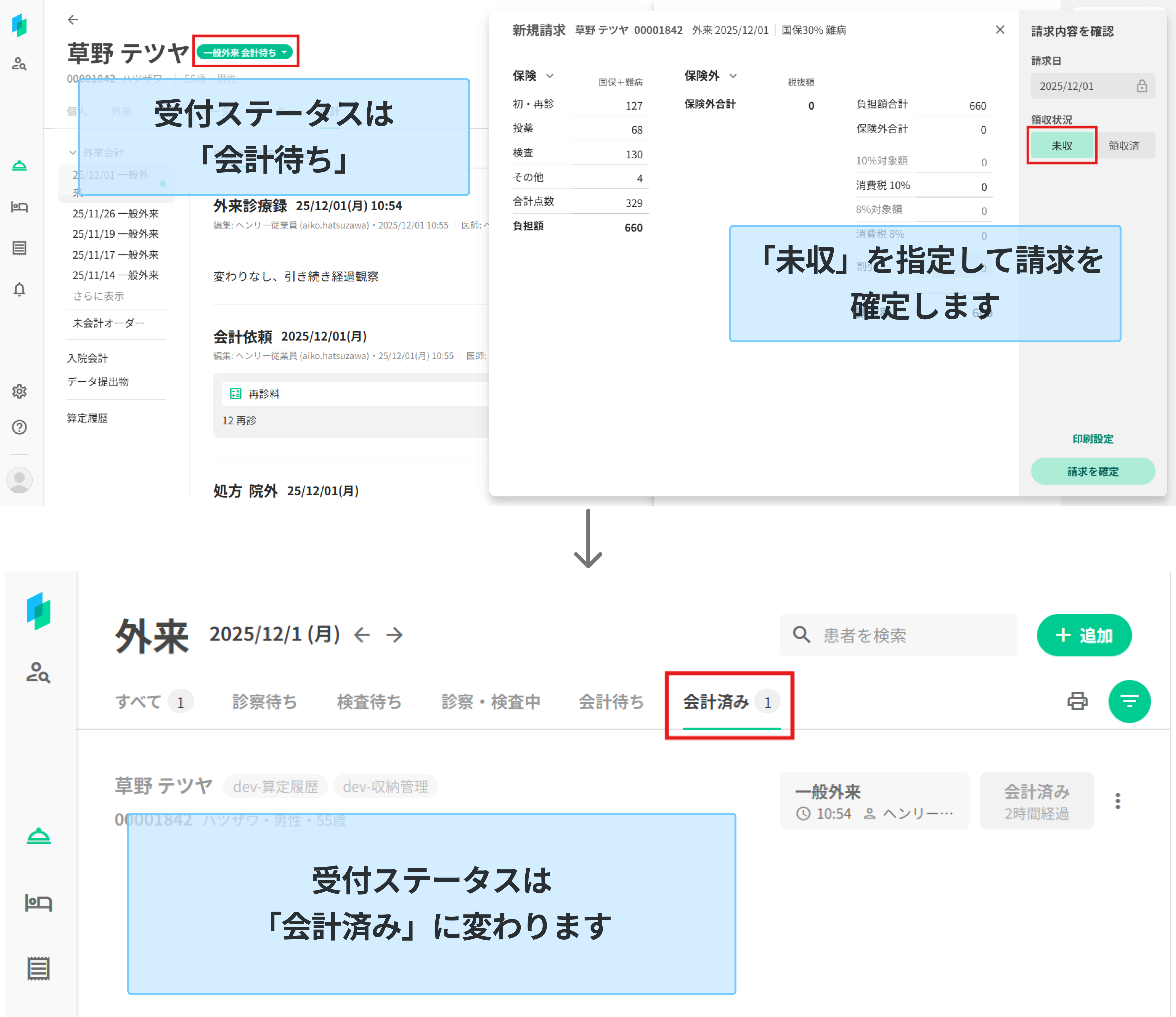 外来精算画面のリニューアルに伴い、未収のまま請求を確定した場合に受付ステータスが「会計待ち」のままとなっておりました。今回のリリースでは、未収のまま請求を確定しても「会計済み」ステータスに移動するよう修正を行いました。