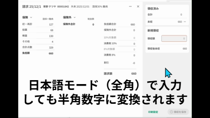 会計画面等の入力で日本語入力モードになっていても、「請求・領収」画面で金額入力の際に入力モードを切り替えることなく入力できます。全角で入力した数字は自動的に半角に変わります。