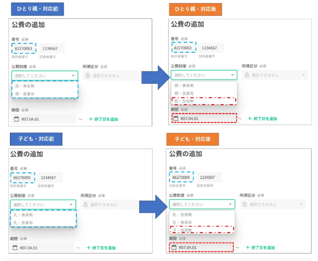 親・負担無]が表示されます。 また、「86」から始まる負担者番号を入力いただくと、公費制度の選択肢に[子・負担無]が表示されます。