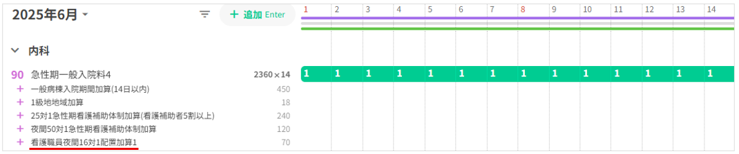 施設基準を満たす病棟に入院している場合、入院料と同一算定単位内に入院日から起算して14日を限度として「看護職員夜間配置加算」を自動算定いたします