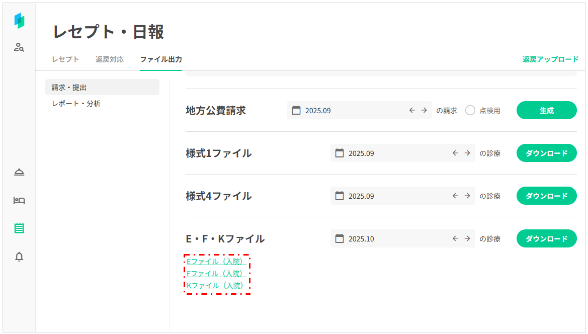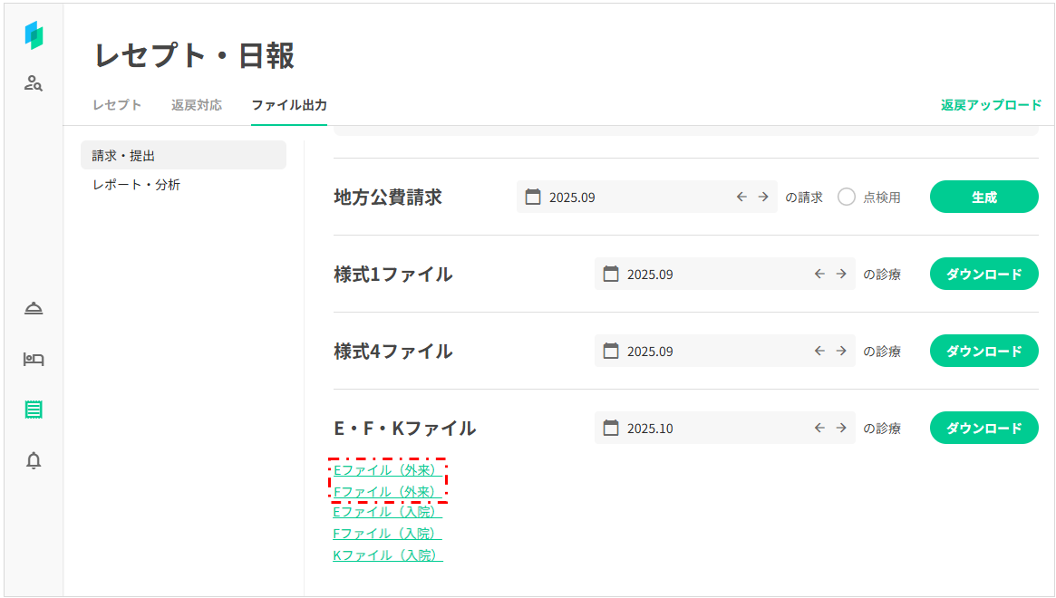 「レセプト・日報>ファイル出力>請求・提出>E・F・Kファイル」でダウンロードボタンを押下すると、データ提出加算1・3算定時には提出不要な外来のEファイル、Fファイルが表示されておりました