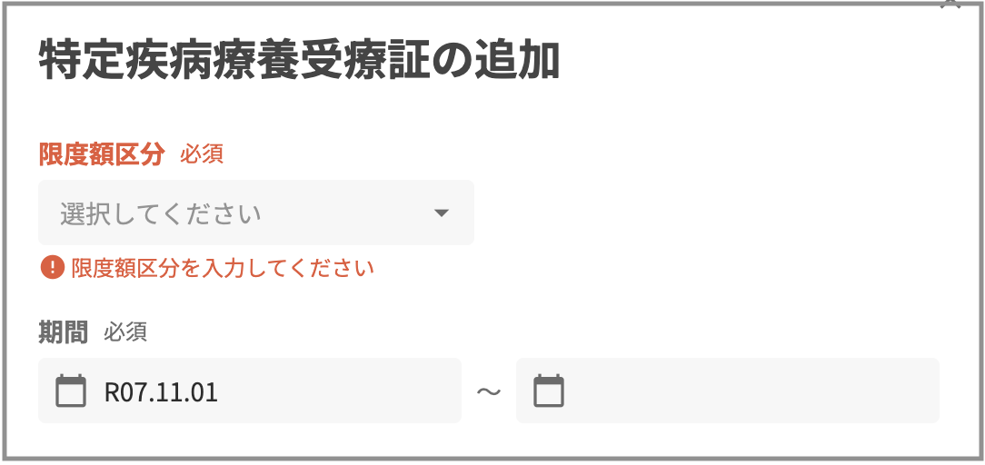 ・特定疾病療養受領証変更後: その月の「月初(1日)」が自動で表示される(終了日は空欄です、入力必須項目ではございません)