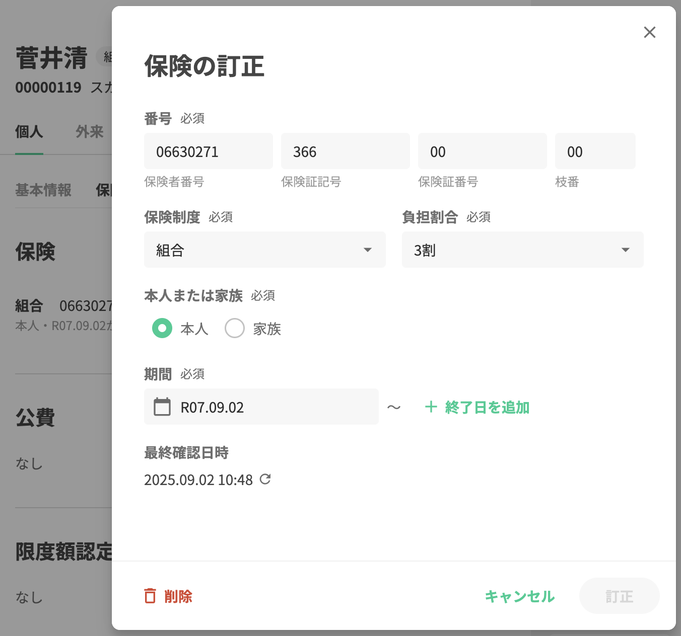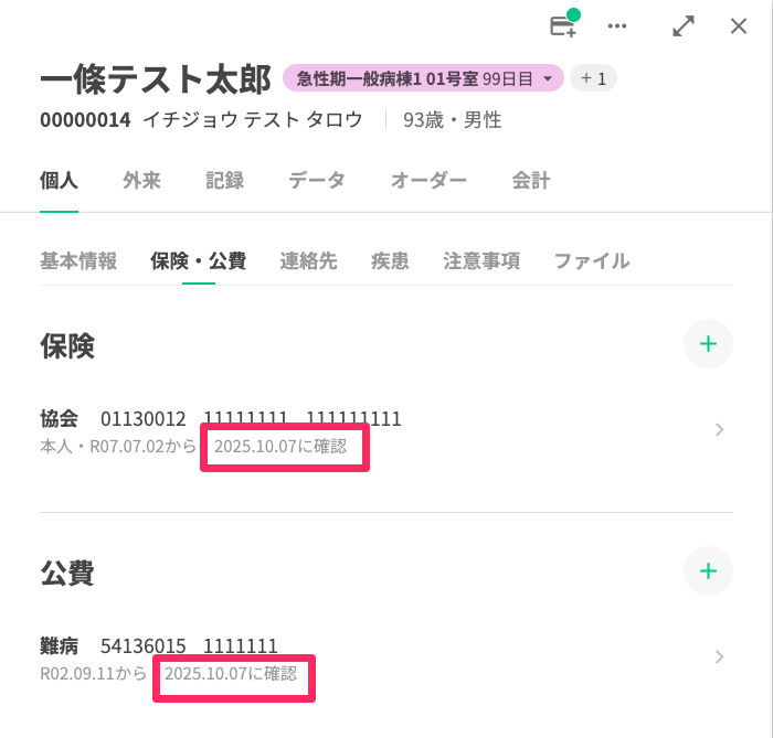 また、今まで保険・公費タブで表示されていた最終確認日については、従来通り最終確認日が表示されます。