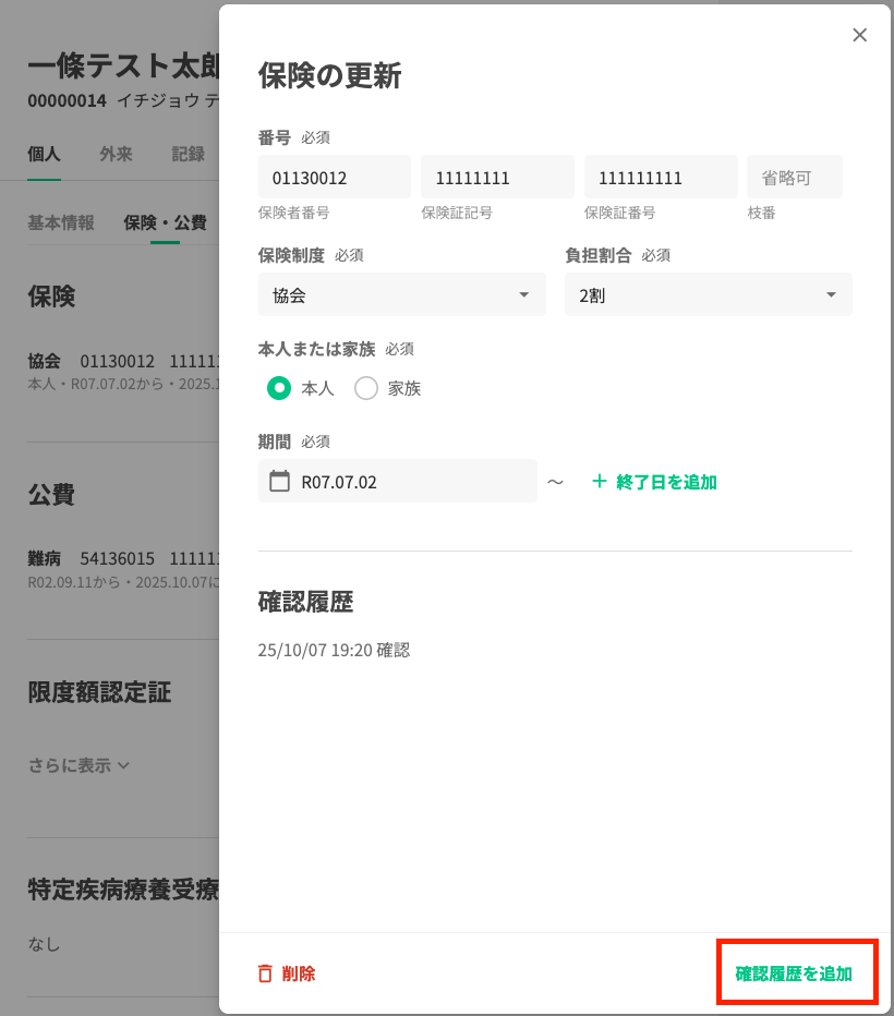 (本機能の名称を「保険の更新」⇛ 「確認履歴を追加」に変更します)