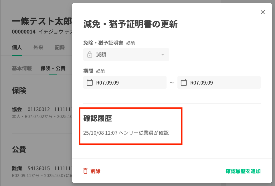 これにより、保険証の期限切れなどでレセプトが返戻された際には、確認履歴を以て対応できるようになります。