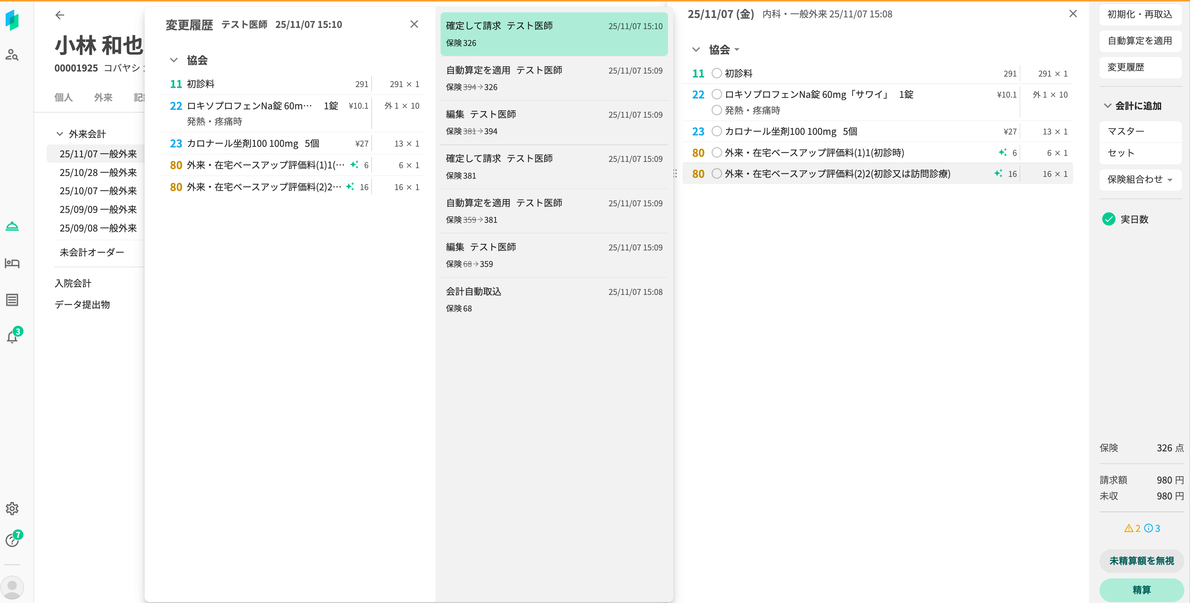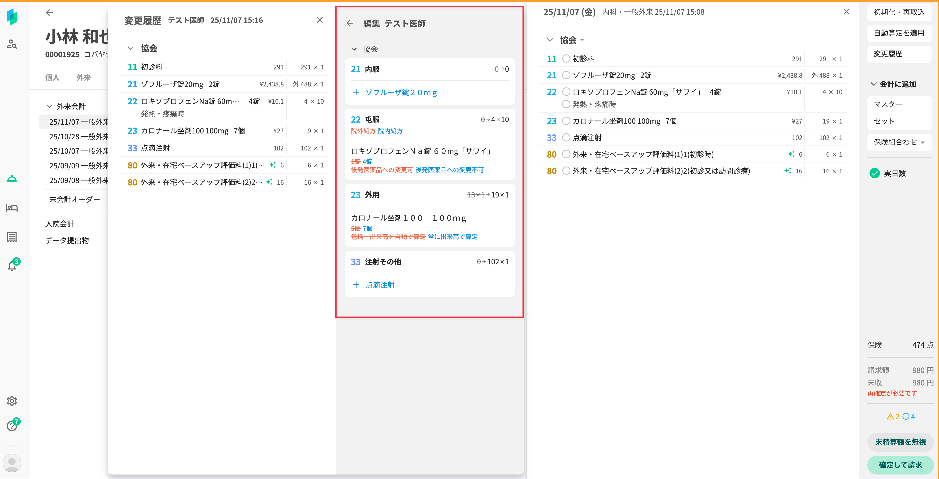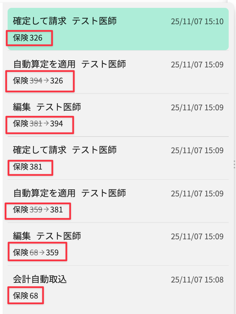 変更履歴の項目に「保険 485→541」のように表示されます。患者への再請求時やレセプト請求時に発生している差額を検証するのに役立ちます。