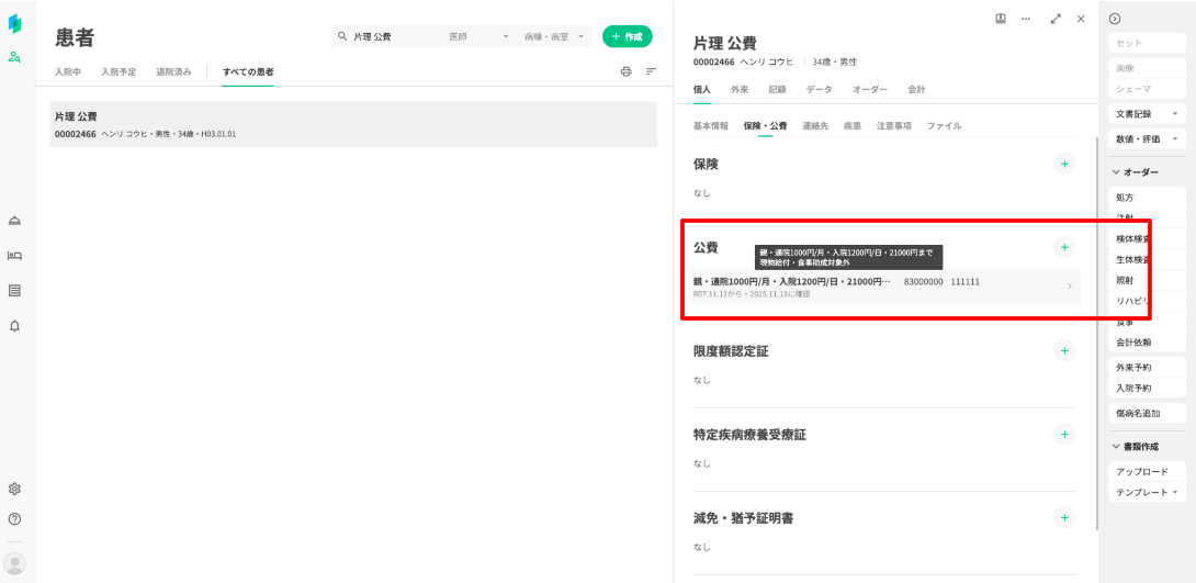 保険・公費の一覧で公費の名称が長い場合には、「親・通院1000円/月・入院1200円/日・21000円…」のように表示し、マウスカーソルをあわせることで省略せず表示できるように修正を行いました