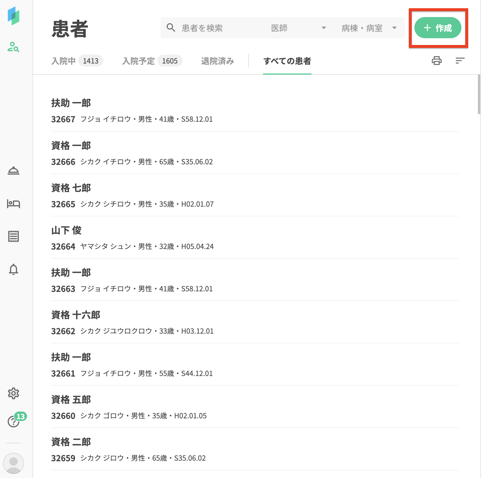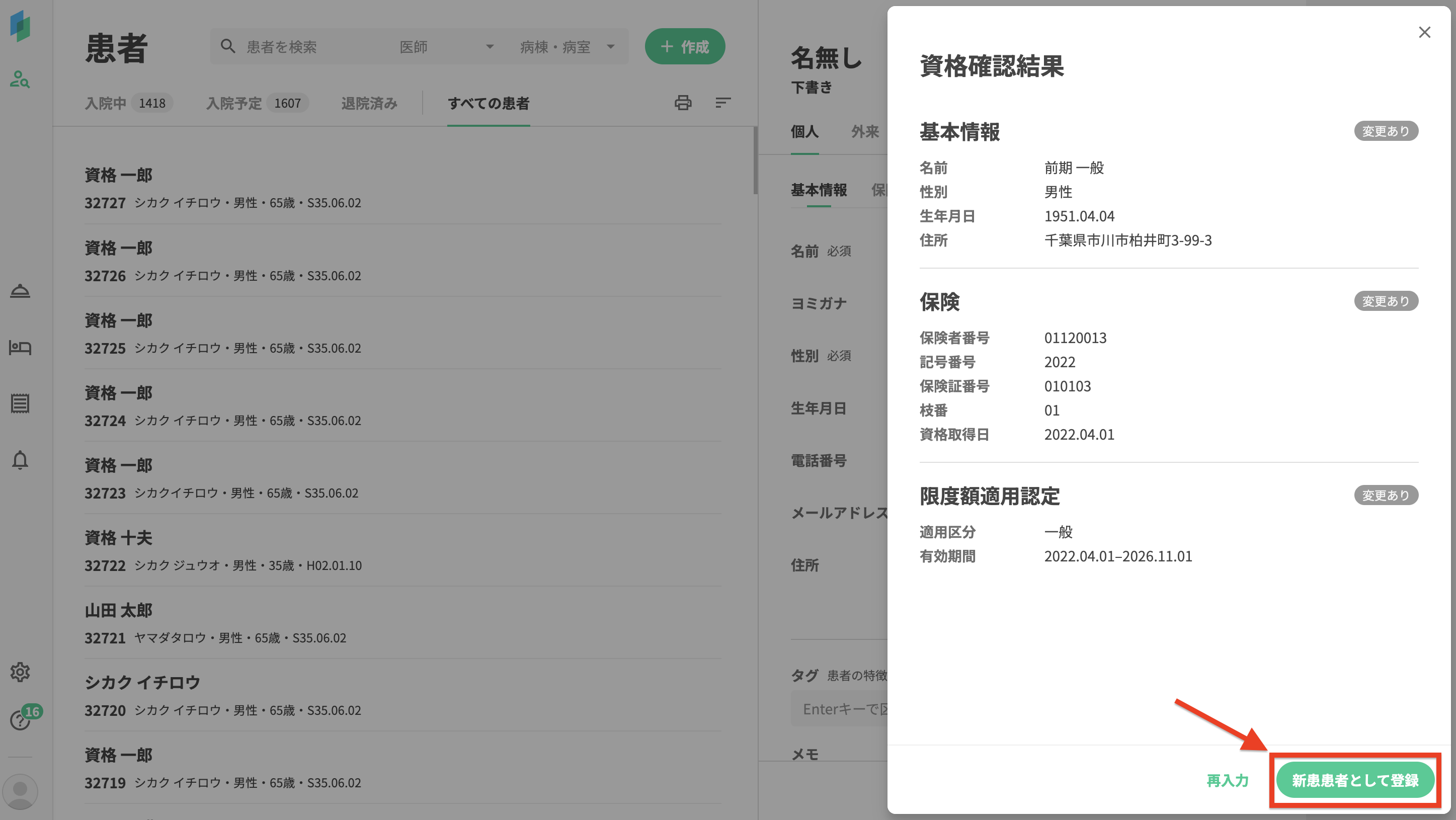 5.「新規患者を登録」をクリックすると、取得した情報を基に、新規患者を登録できます