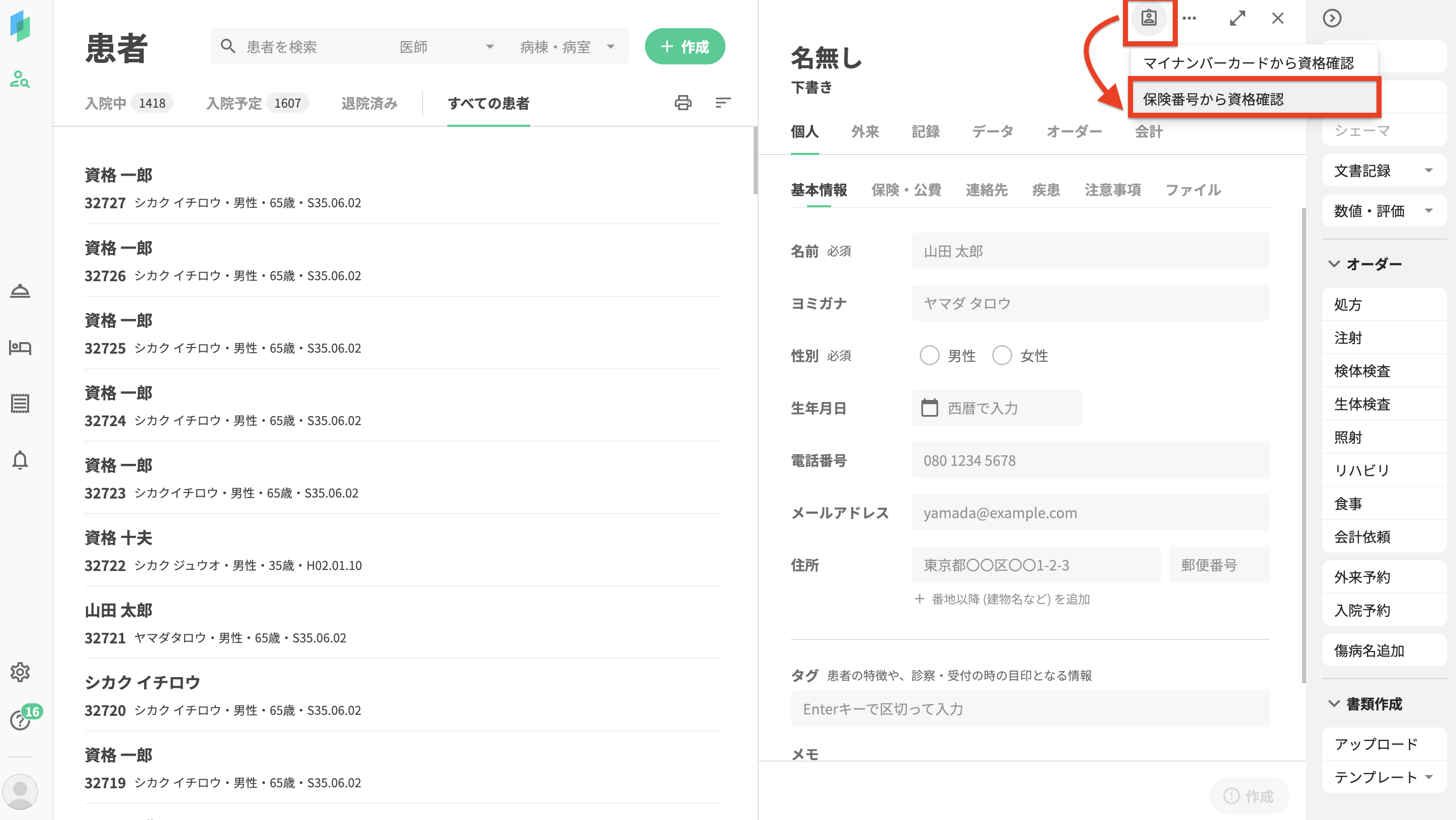 「<確認者名>が保険番号で資格確認」として、確認者と確認日時が記録されます。(新患・再来共通)