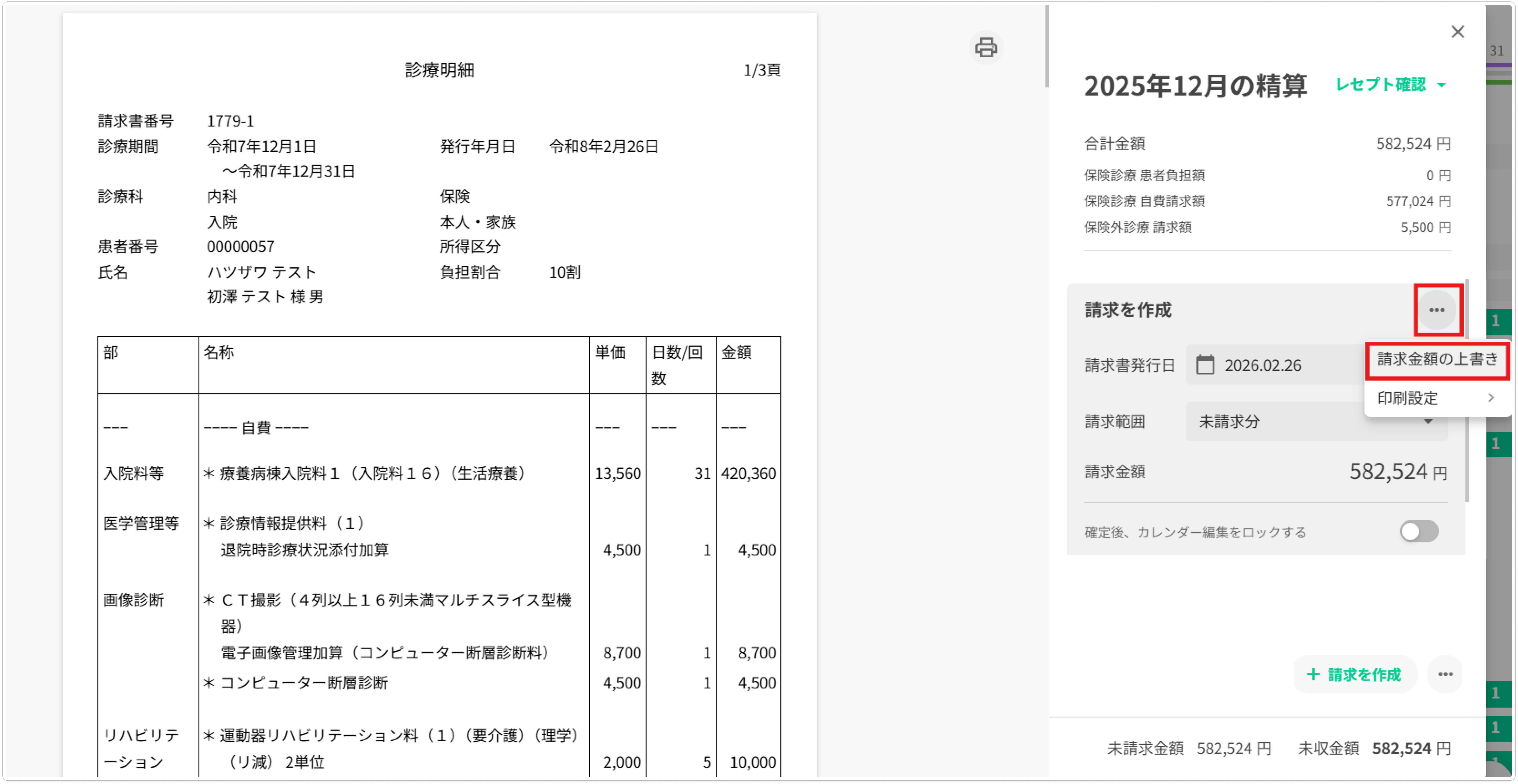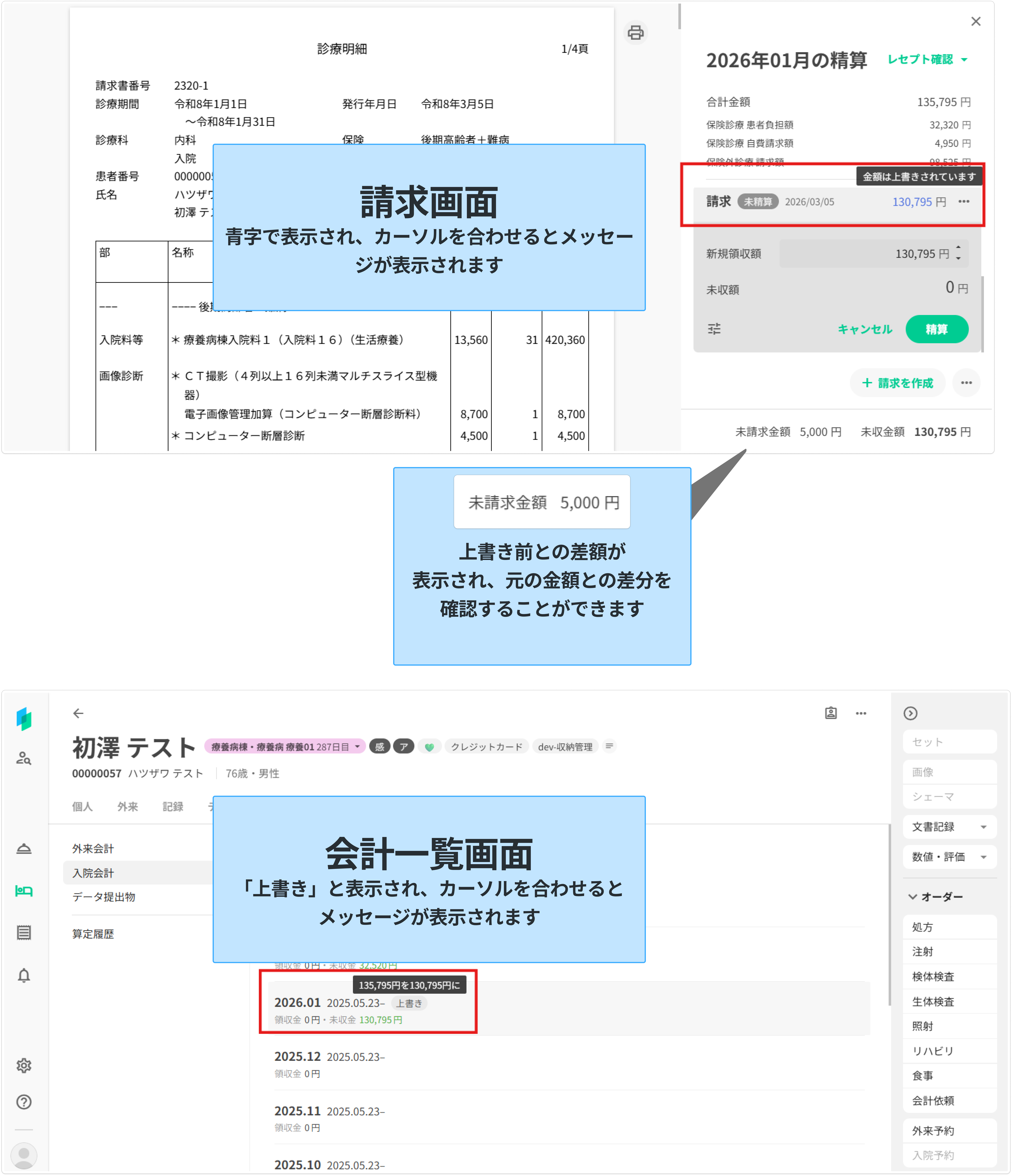 負担額が上書きされた請求は、請求画面上や会計一覧画面上で見分けることができます