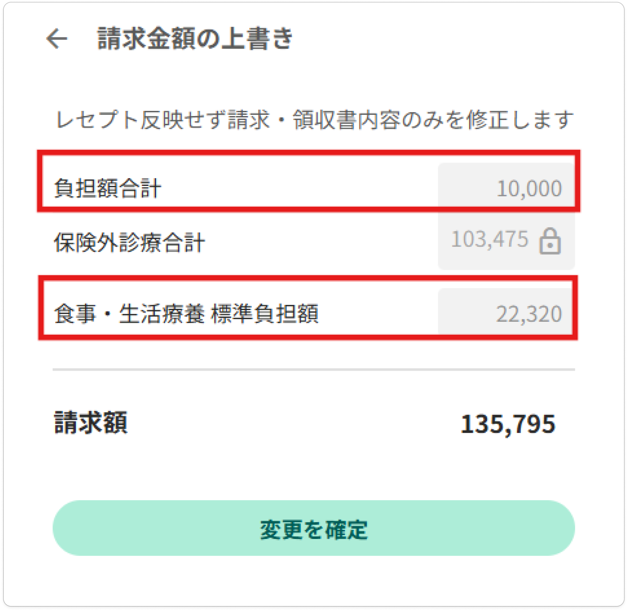 上書きできるのは[負担額合計]と[食事・生活療養標準負担額]の2か所です。必要に応じて修正し、[変更を確定]を押下します