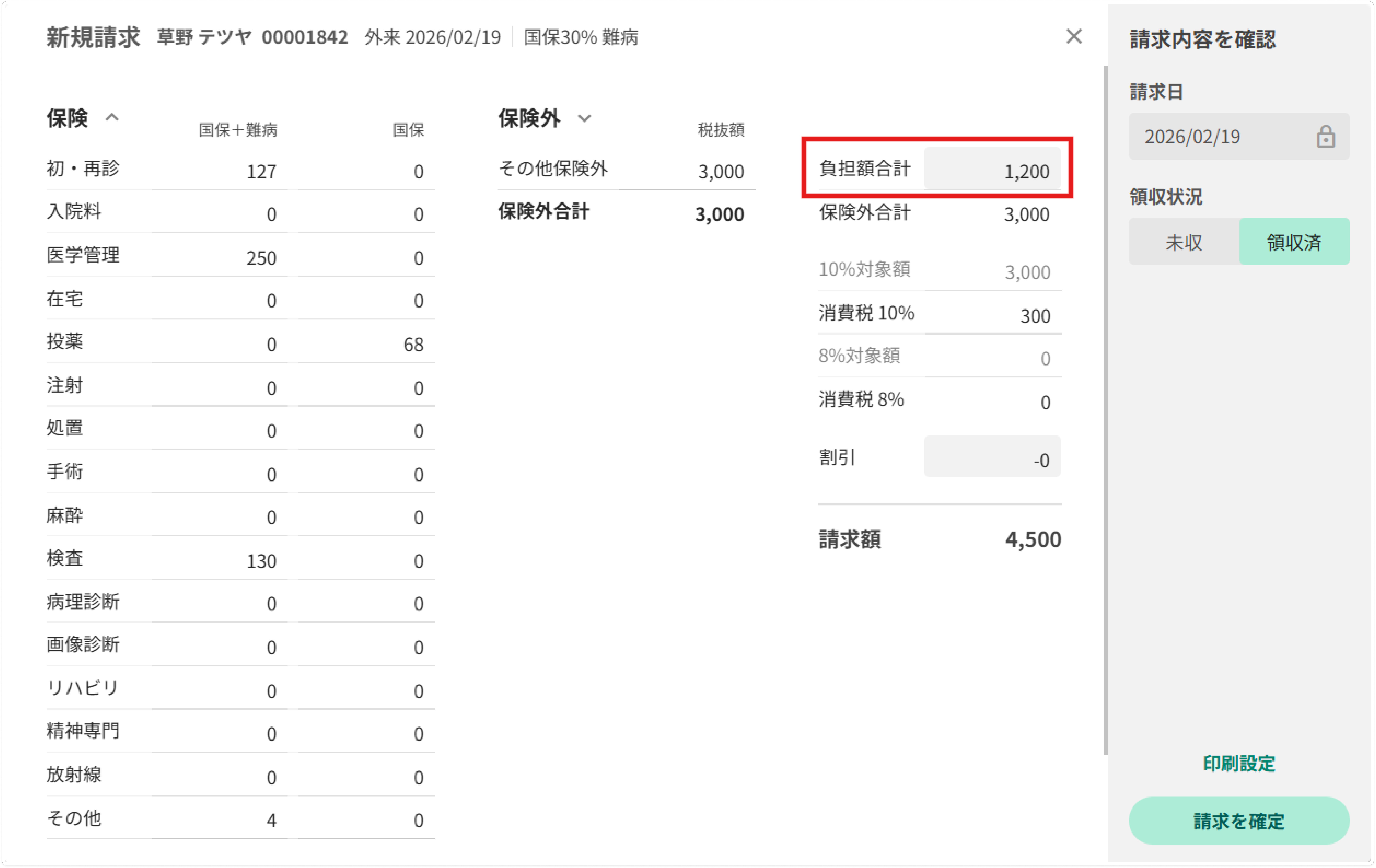 [負担額合計]と[割引]欄が編集可能になっています。必要に応じて修正し、[請求を確定]を押下します