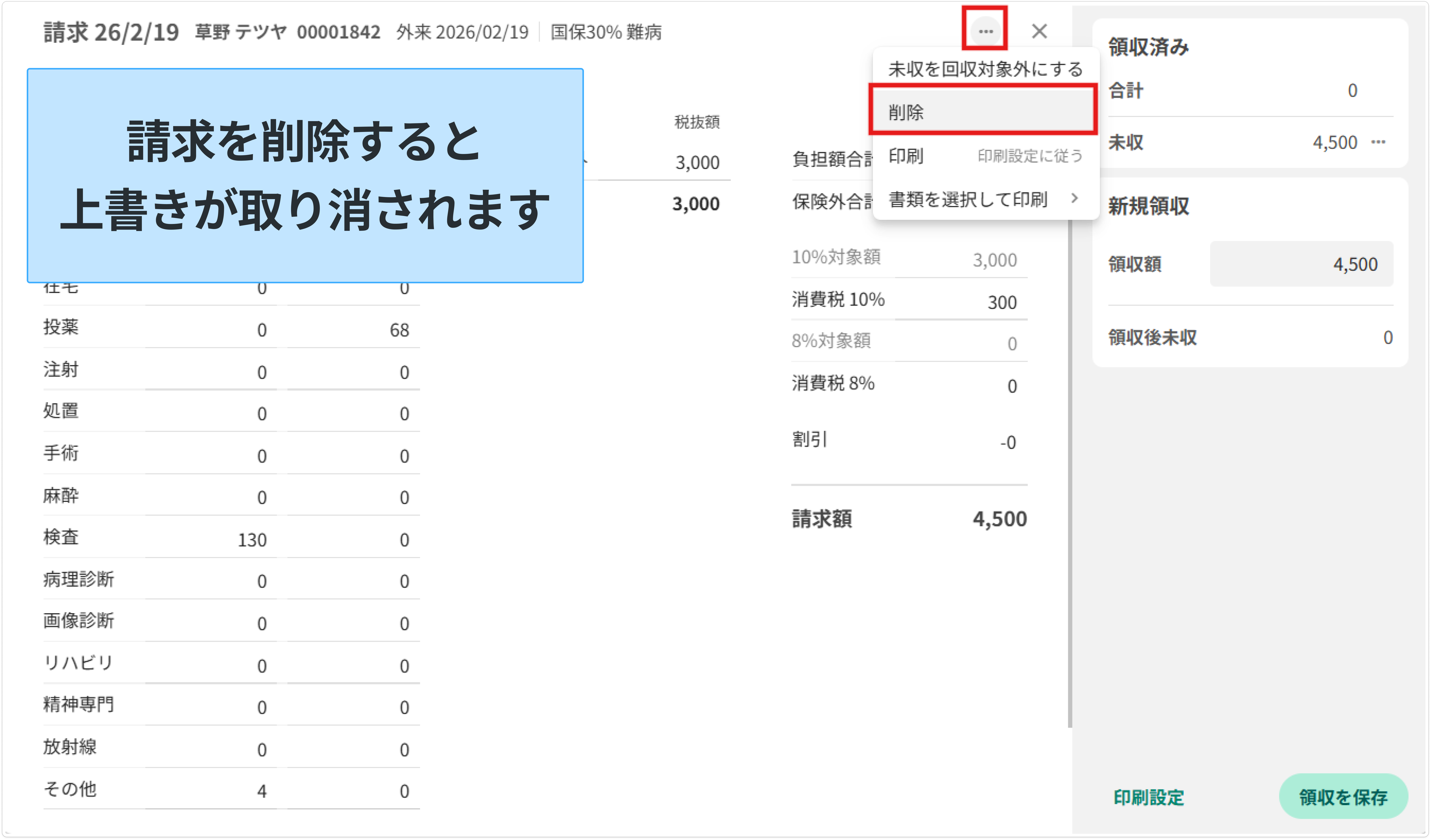 請求・領収画面に戻ると金額が青文字で表示され、上書きされていることがわかるようになっています