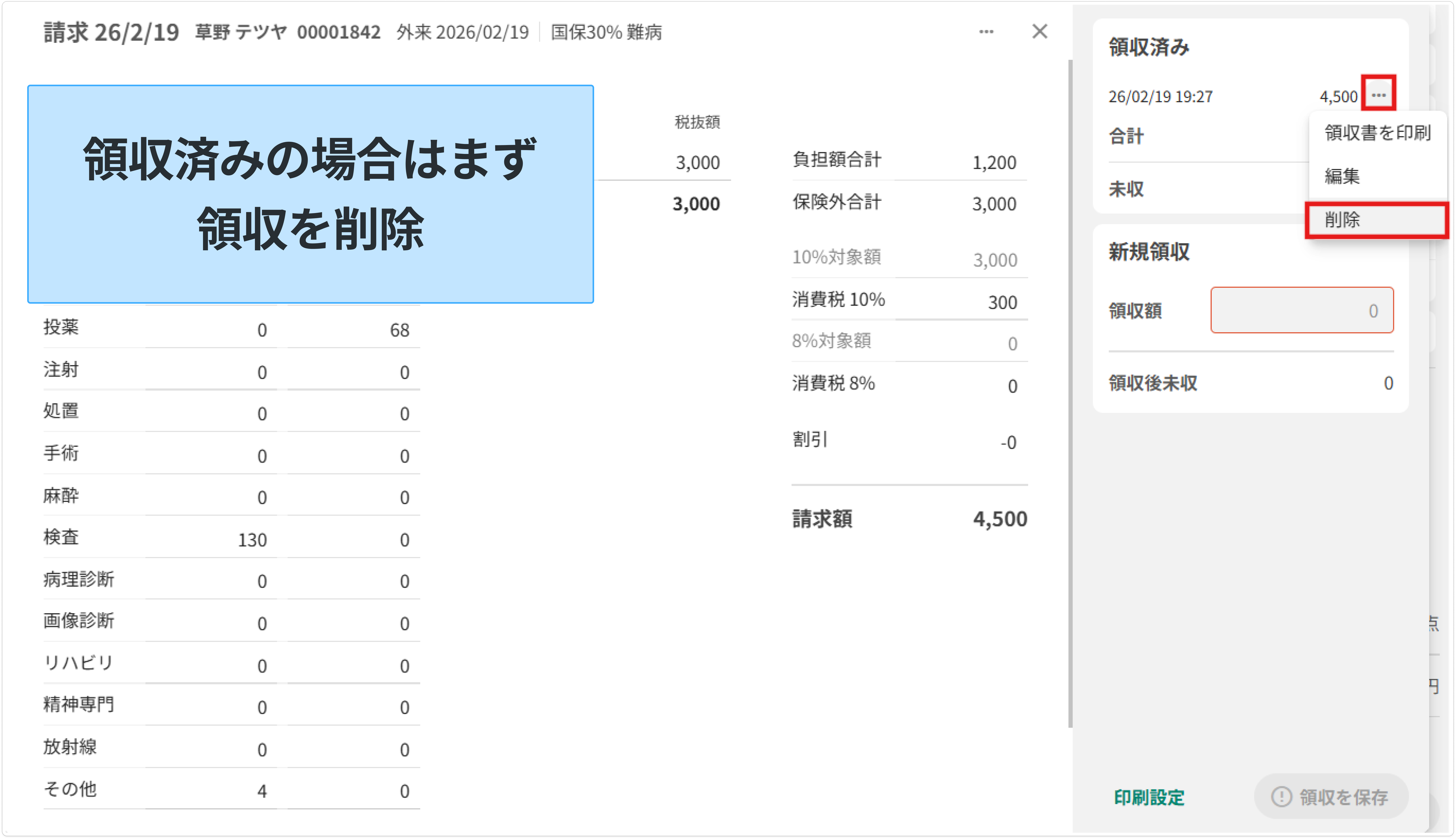 領収済みの場合は、以下の画像を参考にまず領収を削除してから請求を削除する必要があります。