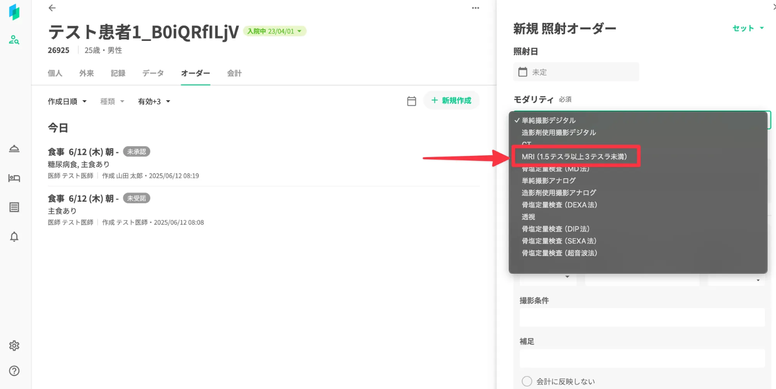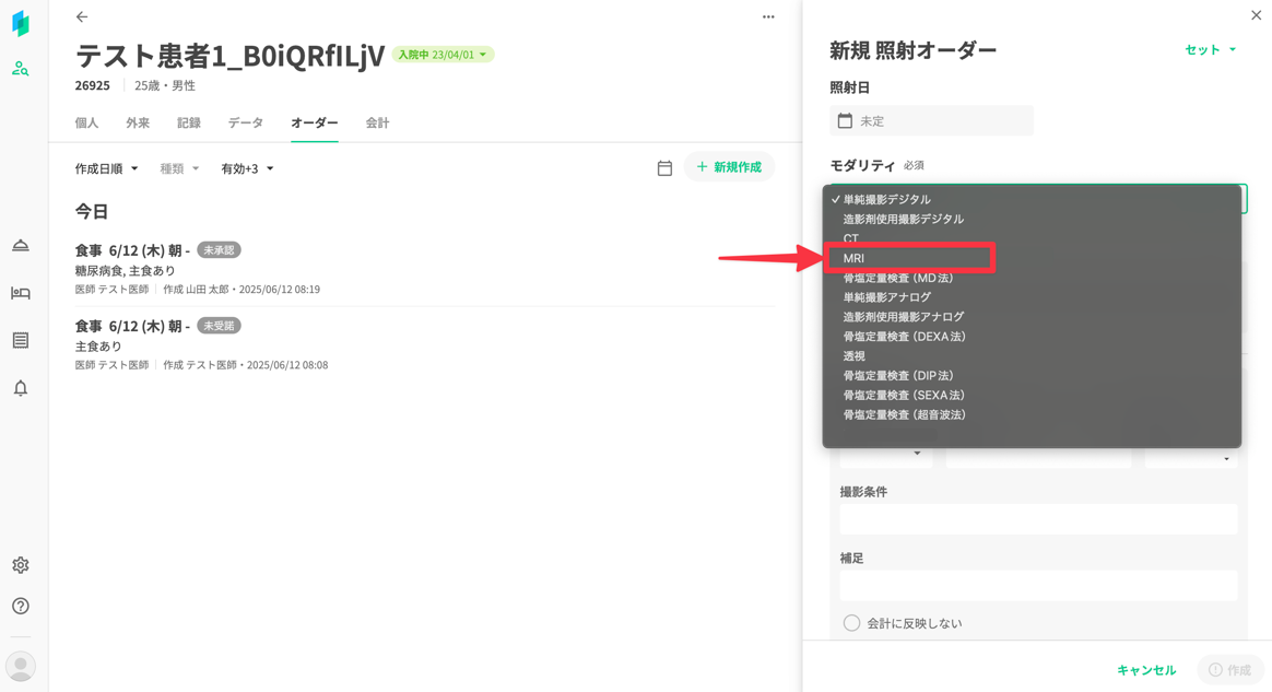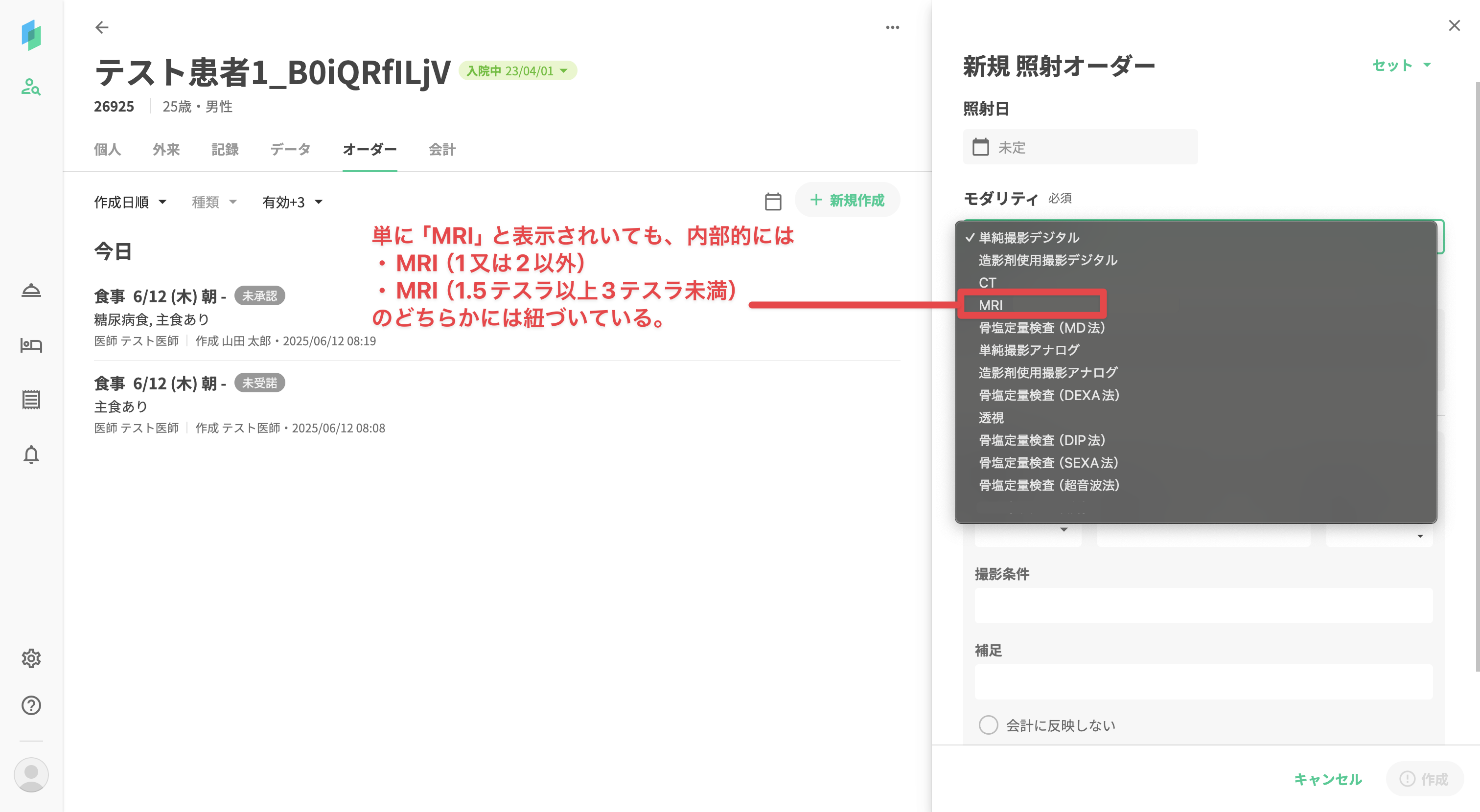 照射オーダーを出すためにモダリティを選択すると単に「MRI」と表示していました