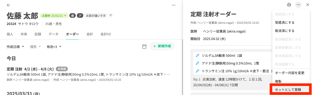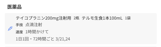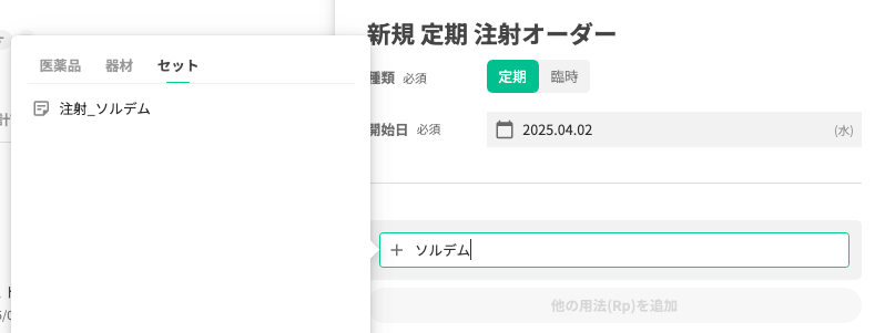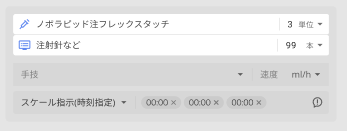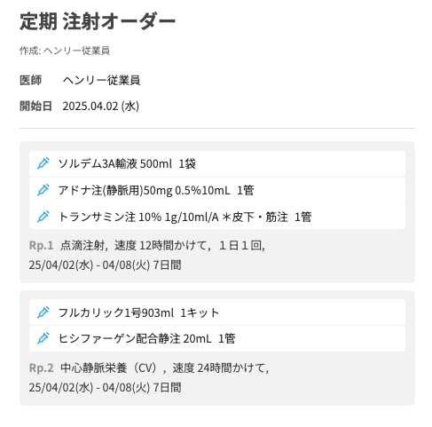 項目は「定期 or 臨時 > 手技 > 速度 > 用法 > (日数) 」の順番で表示します