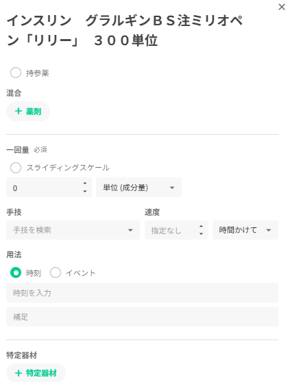 これまで:薬剤の詳細画面で「スライディングスケール」にチェックを入れた状態で用法を登録します。また用量は「1回量」の入力です