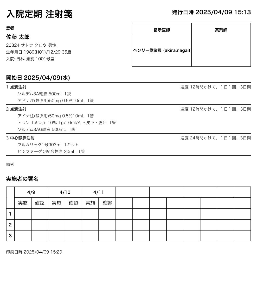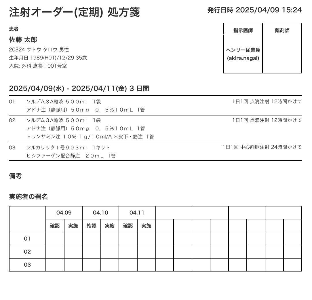※注射オーダーではお薬手帳シール・薬剤情報提供書は印刷対象外です。