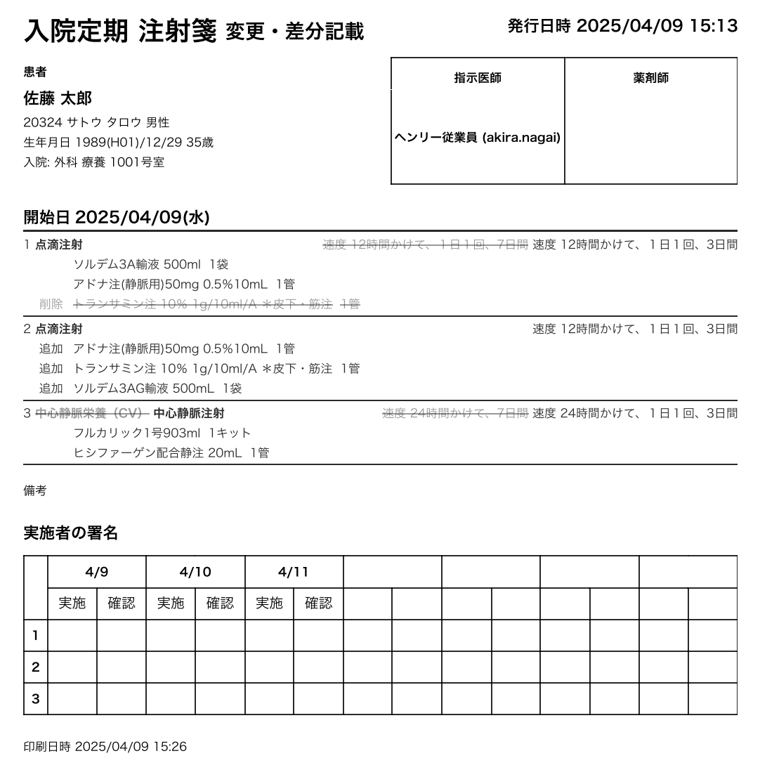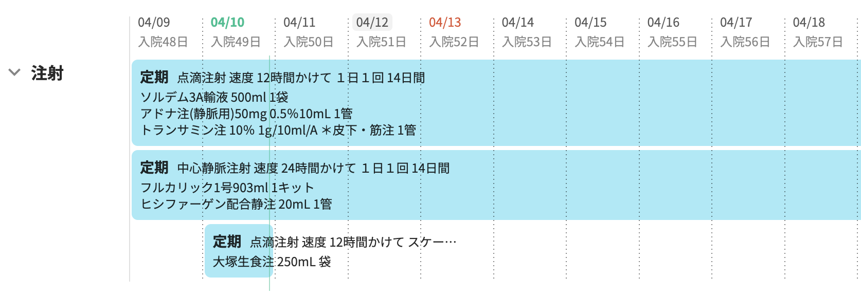 リリース前に作成された注射オーダーで"スケール指示 且つ 1日より長い日数が設定されているオーダー"は日数の情報を「補足」に記載しております。