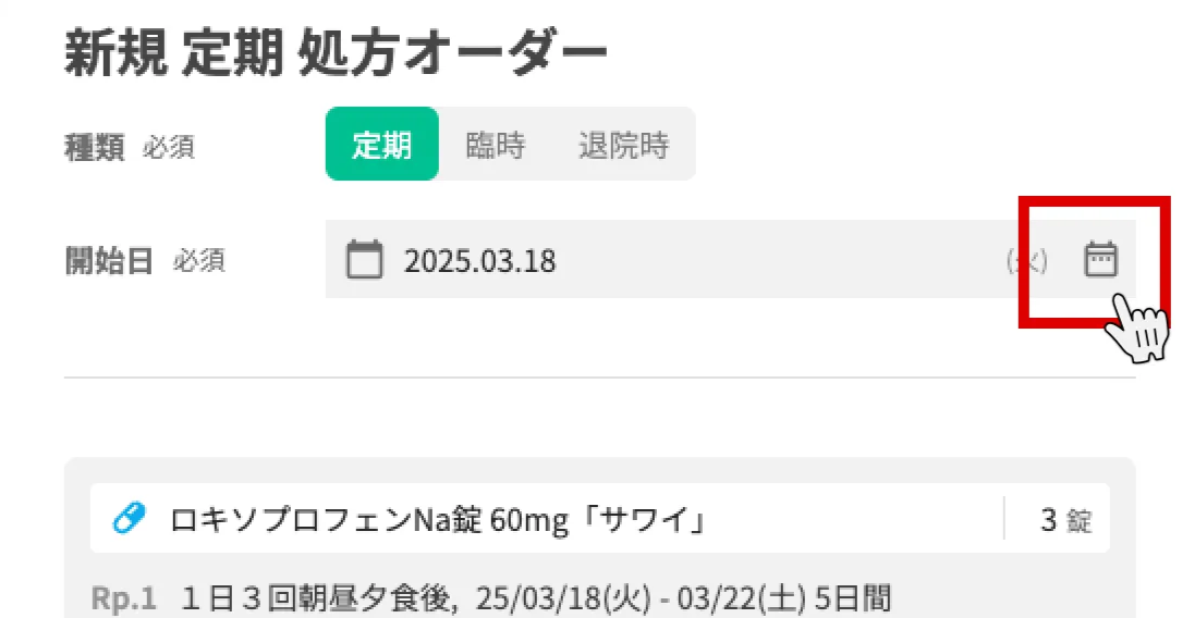 1.処方オーダーの開始日入力欄右端のカレンダーアイコンをクリックします