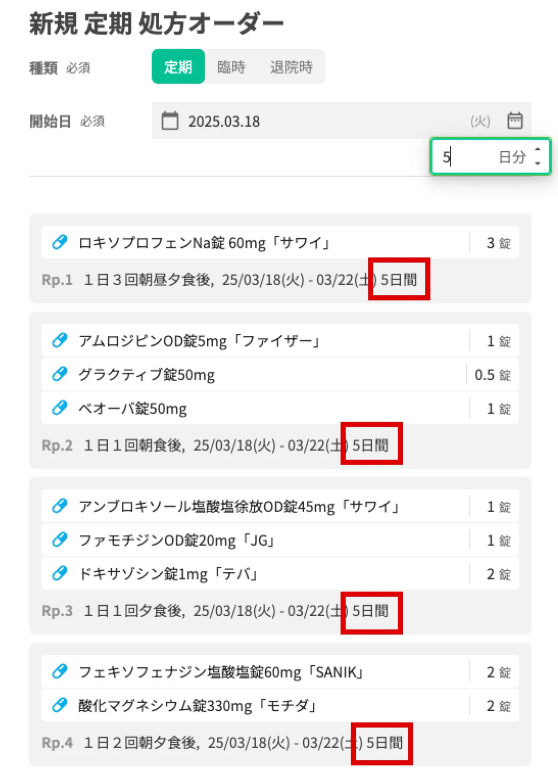 3.変更した日付に合わせて、処方オーダー内の全てのRpの処方期間が一括で変更反映します
