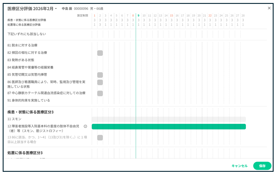 医療区分評価表の内容と、コスカレ(コストカレンダー)に反映されている医療区分が一致しない場合があります。この場合、医療区分評価表を再チェックすることで、正しい医療区分がコスカレに反映されます。