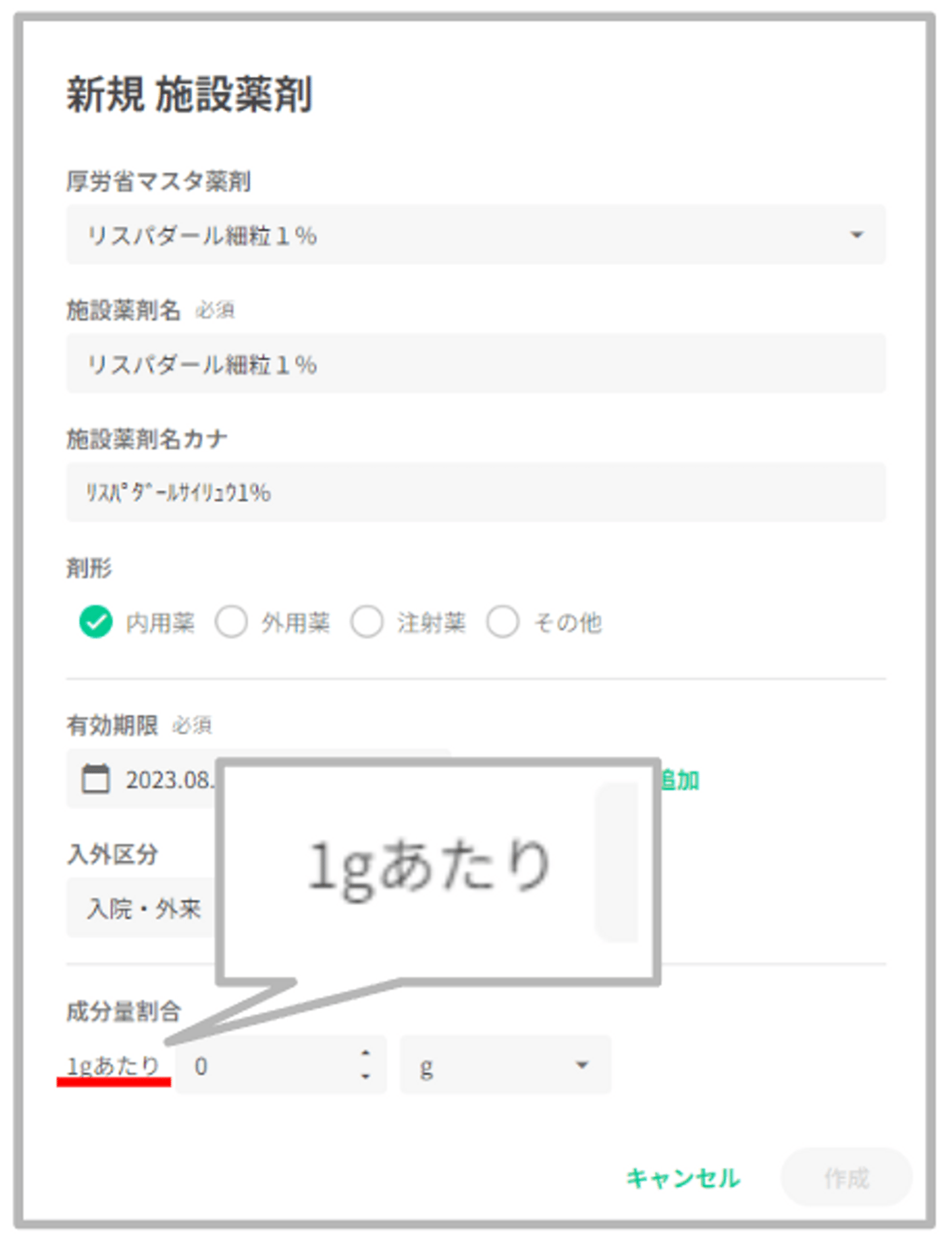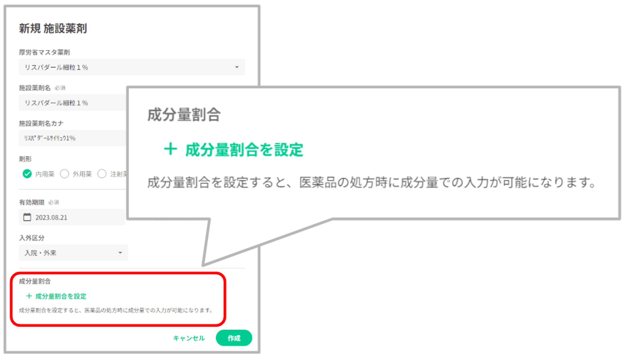 成分量設定方法の詳細は「1. 施設薬剤作成時の成分量割合の設定について」をご確認ください。