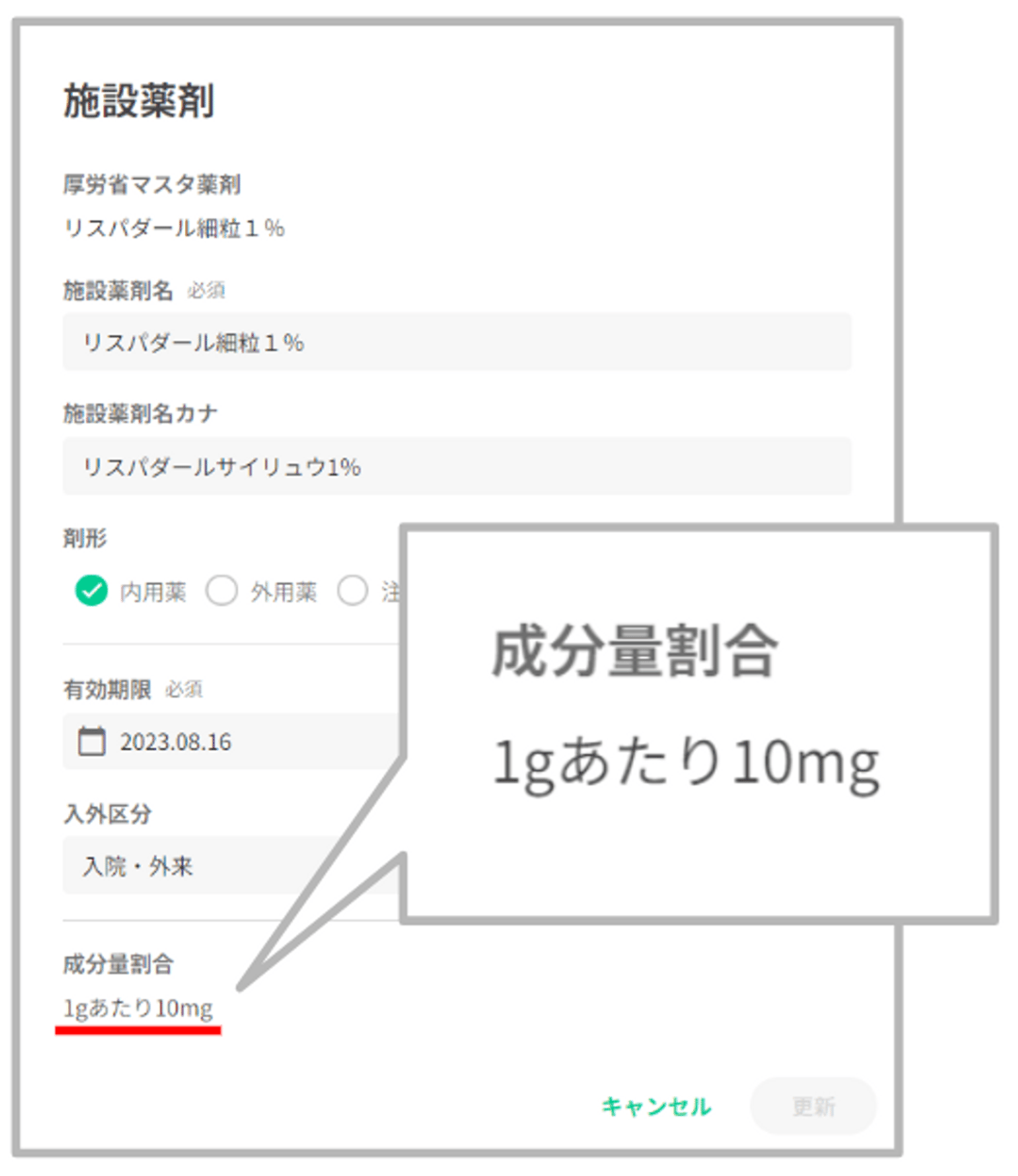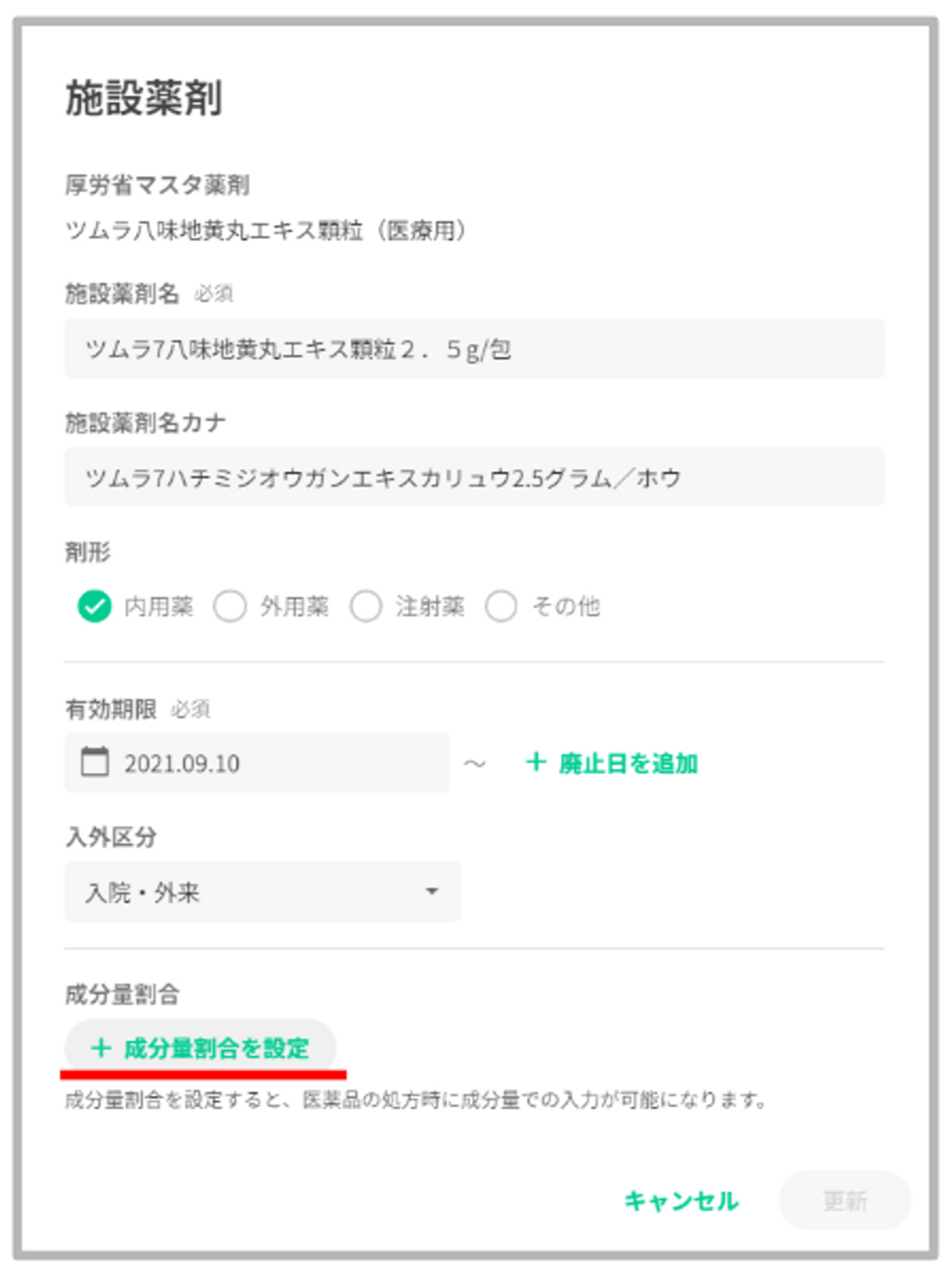 施設薬剤の設定画面の最下部に「成分量割合」の欄が表示されます。成分量割合を設定すると、医薬品の処方時に成分量での入力が可能になります。