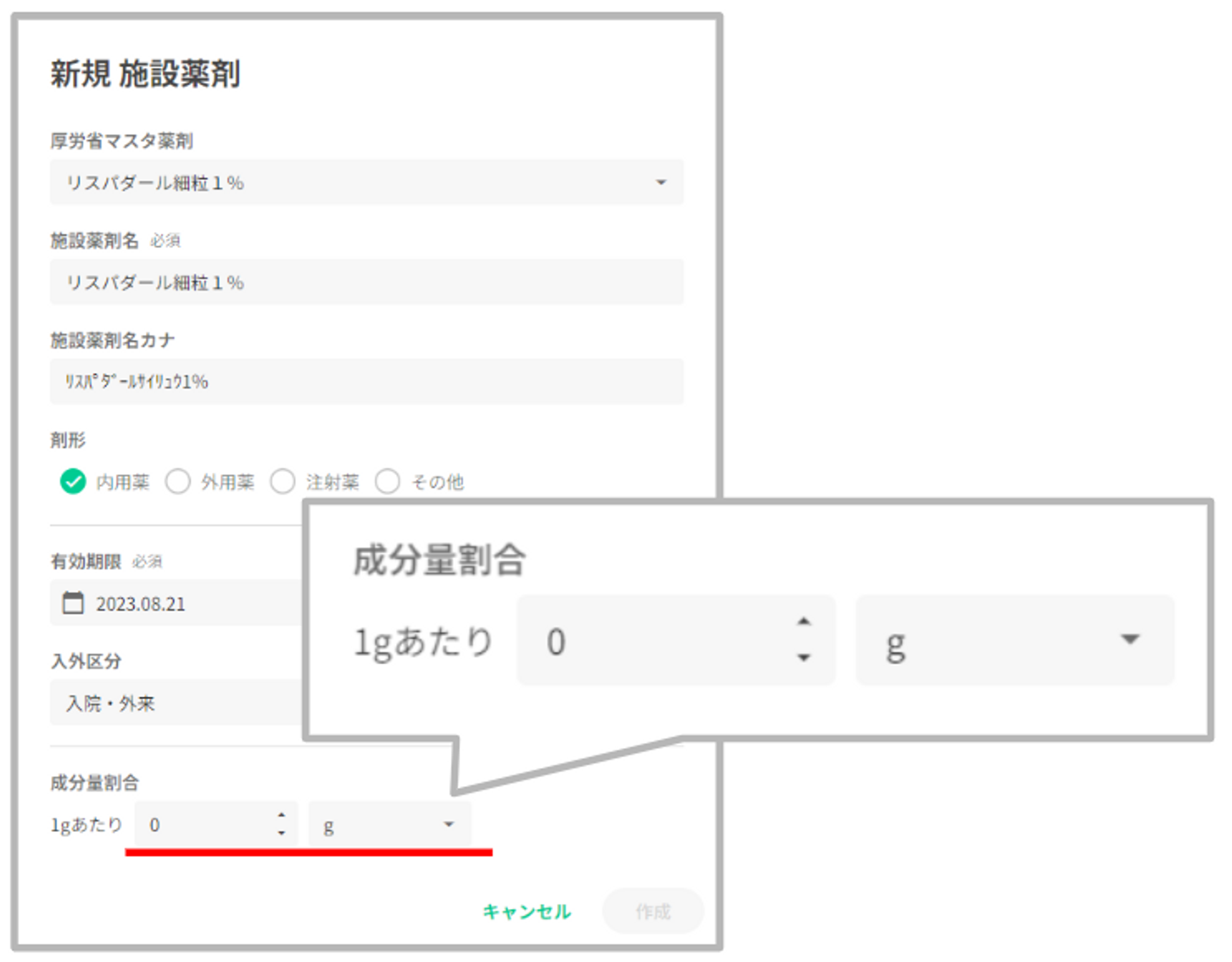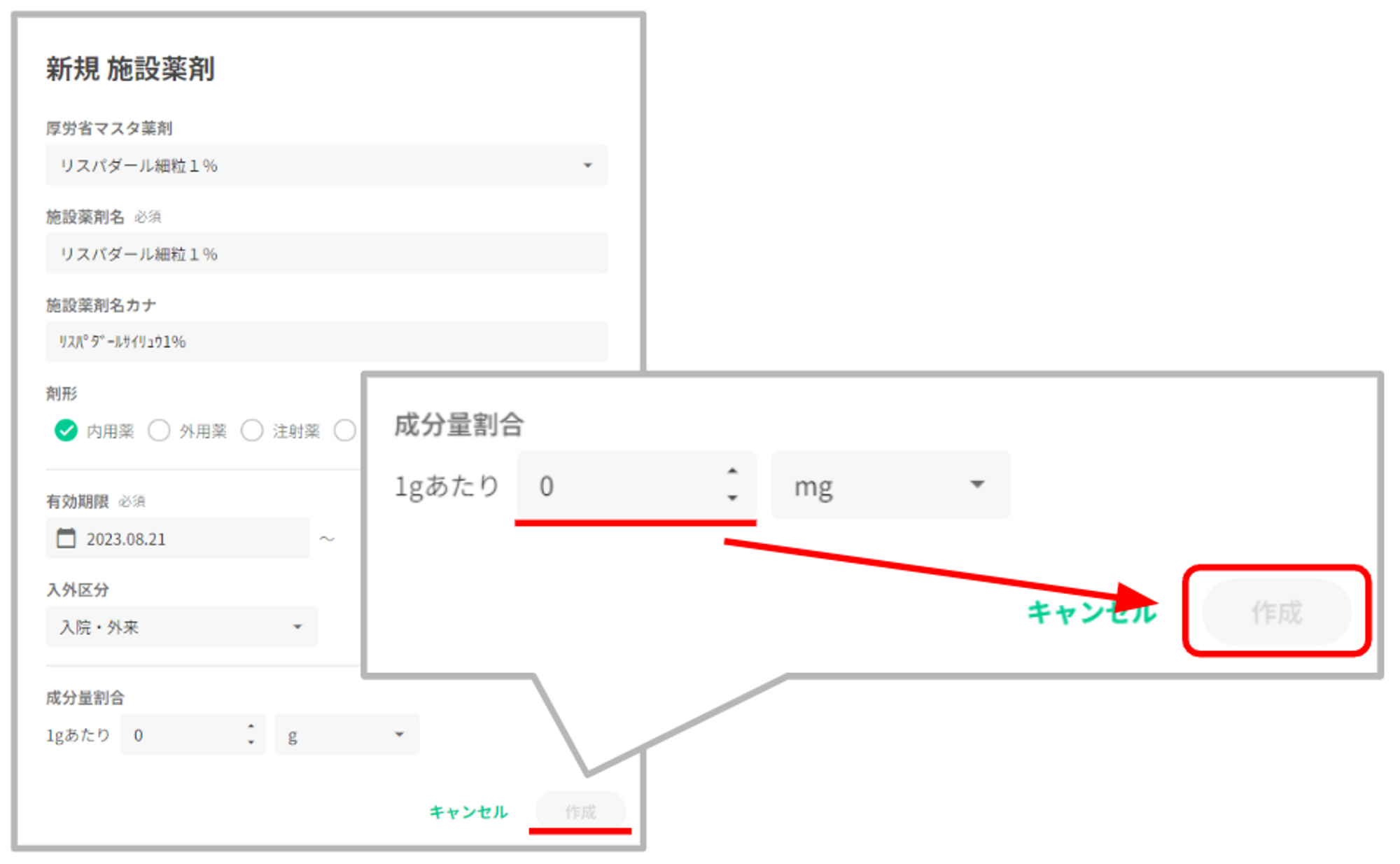 +成分量割合を設定」を押下した場合は、一度キャンセルし初めからやり直していただけますようお願い申し上げます。成分量入力欄を展開した状態で成分量が「0」になっていると作成ボタンは押下できませんのでご留意ください。
