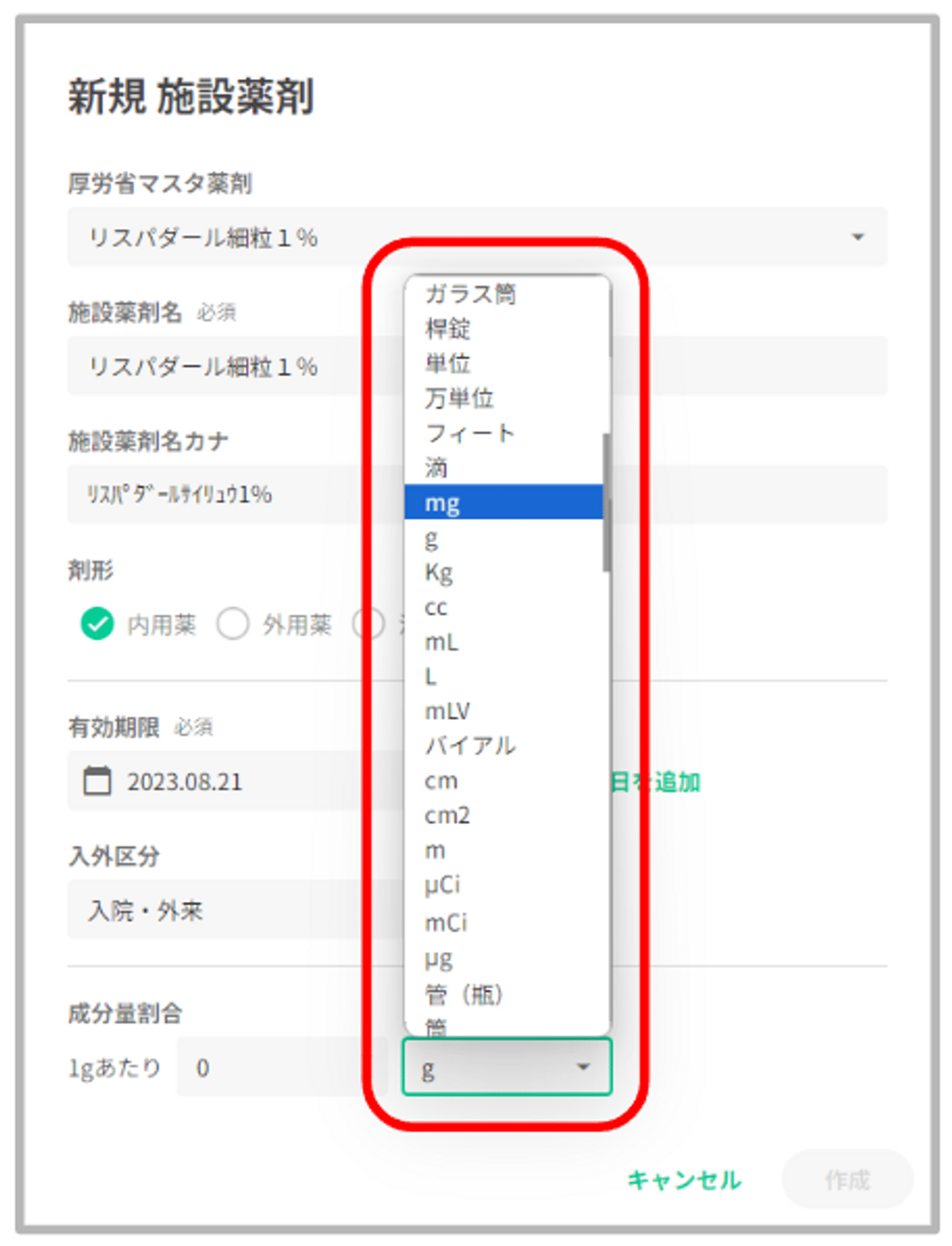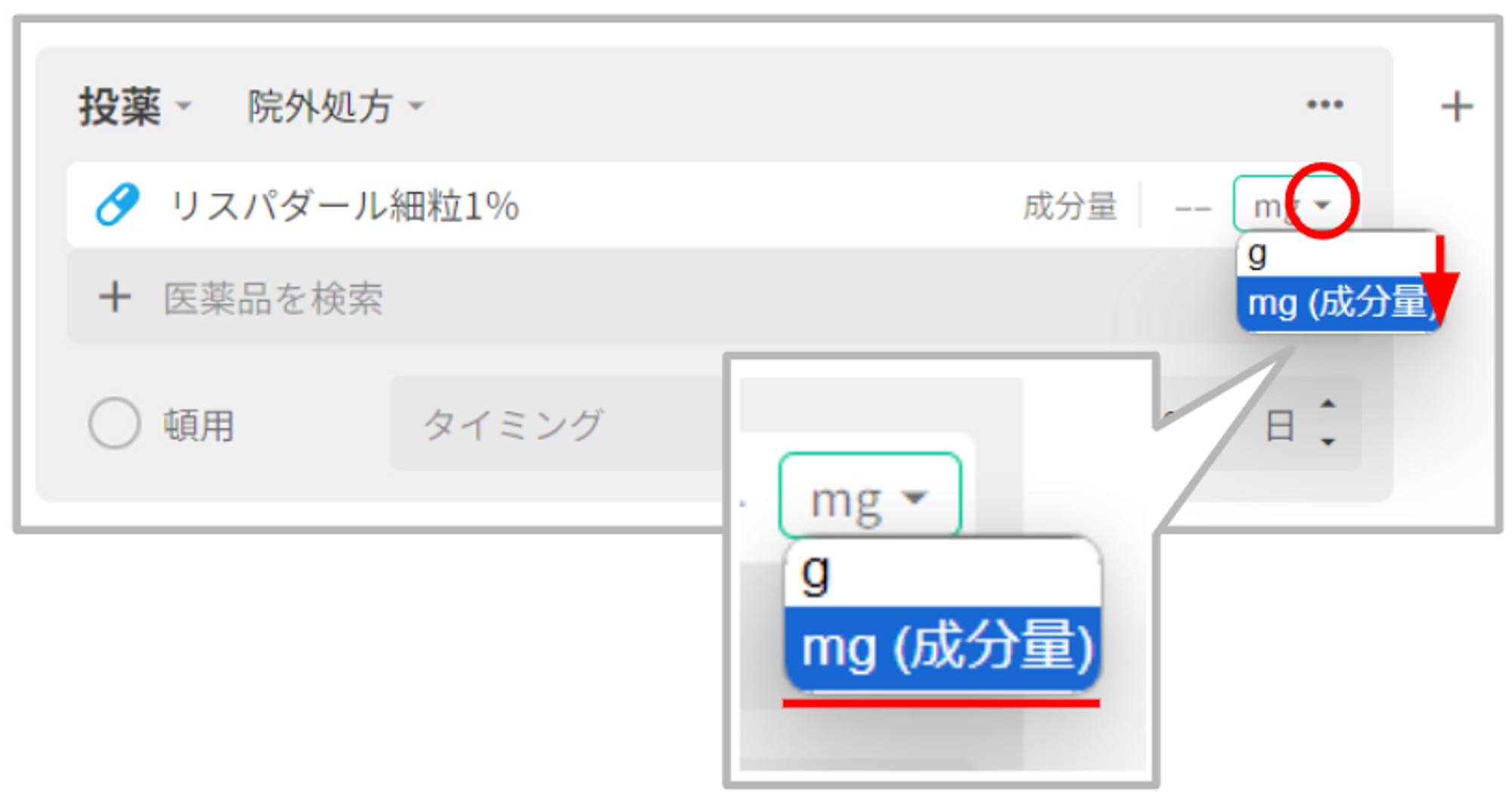 単位横に表示されている「▼」ボタンを押下すると、「製剤量単位」「成分量単位」から任意の単位を選択し入力していただくことが可能です。
