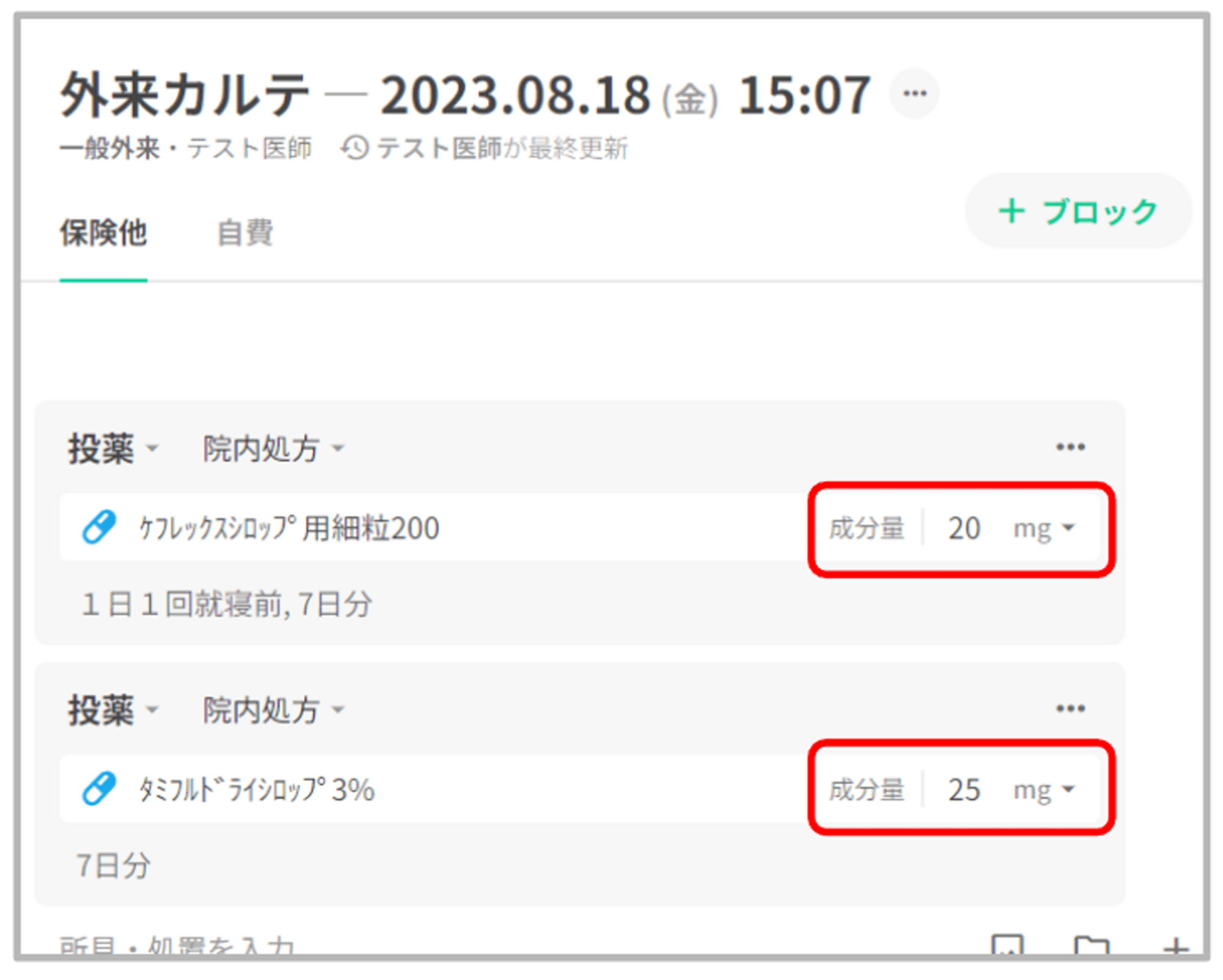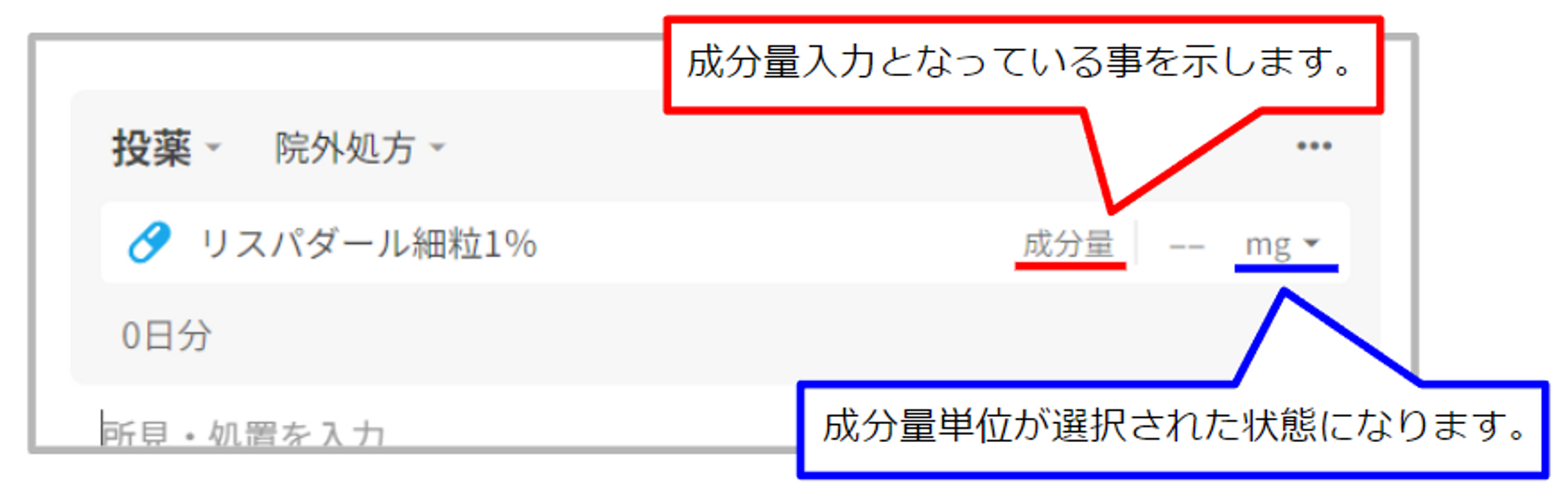 成分量設定のある医薬品を追加すると成分量での入力が可能となります。