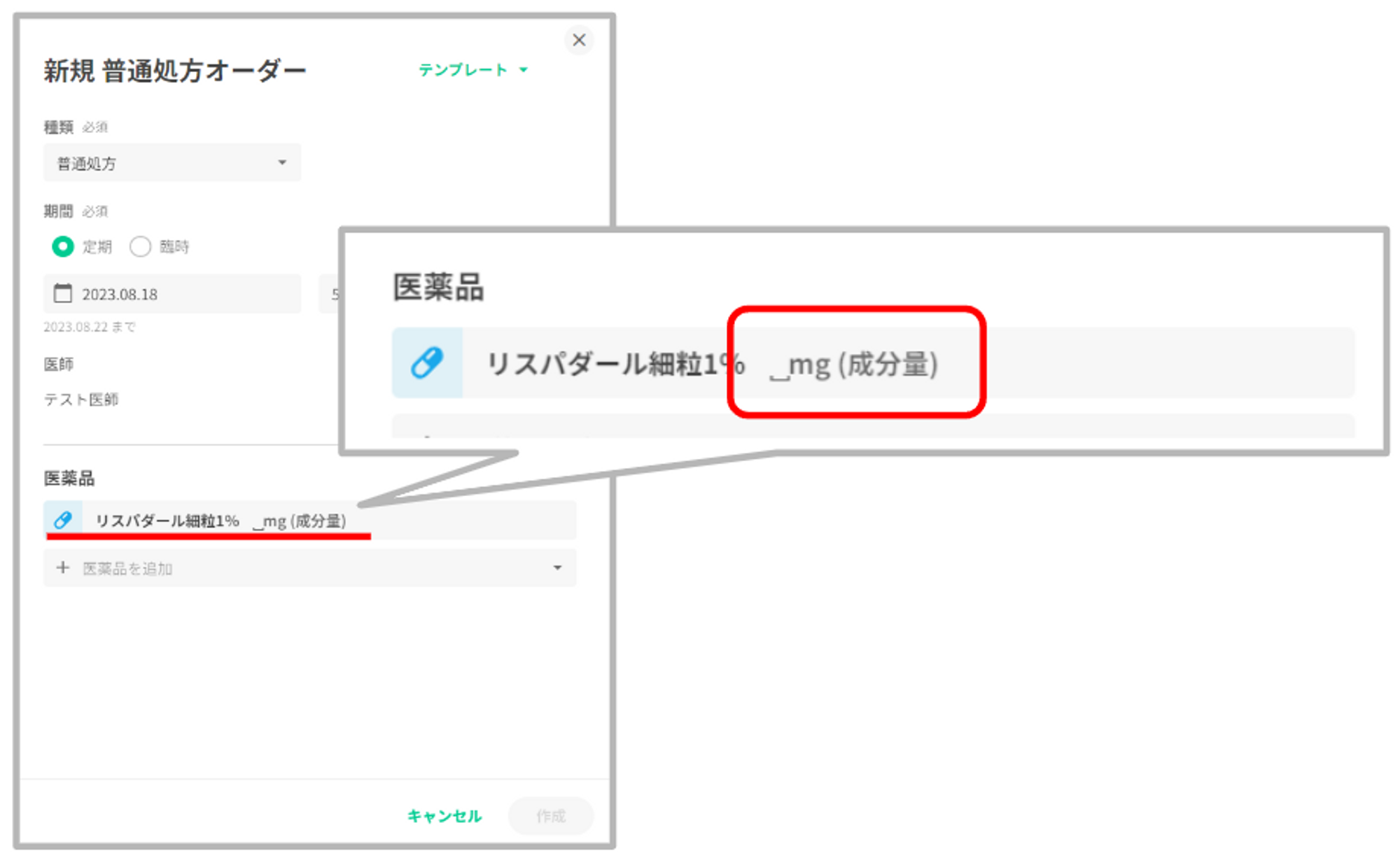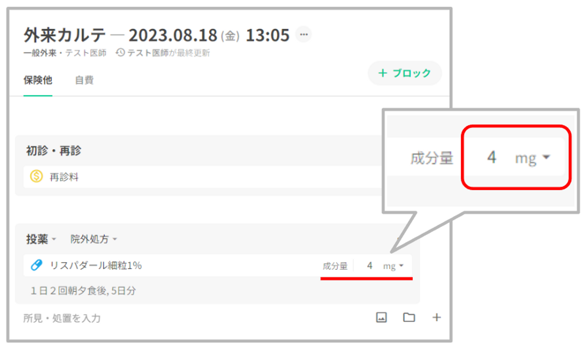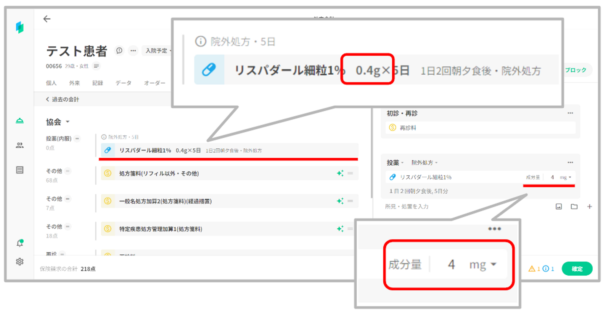 外来カルテと投薬オーダー画面で、製剤量だけではなく成分量でも入力ができます。