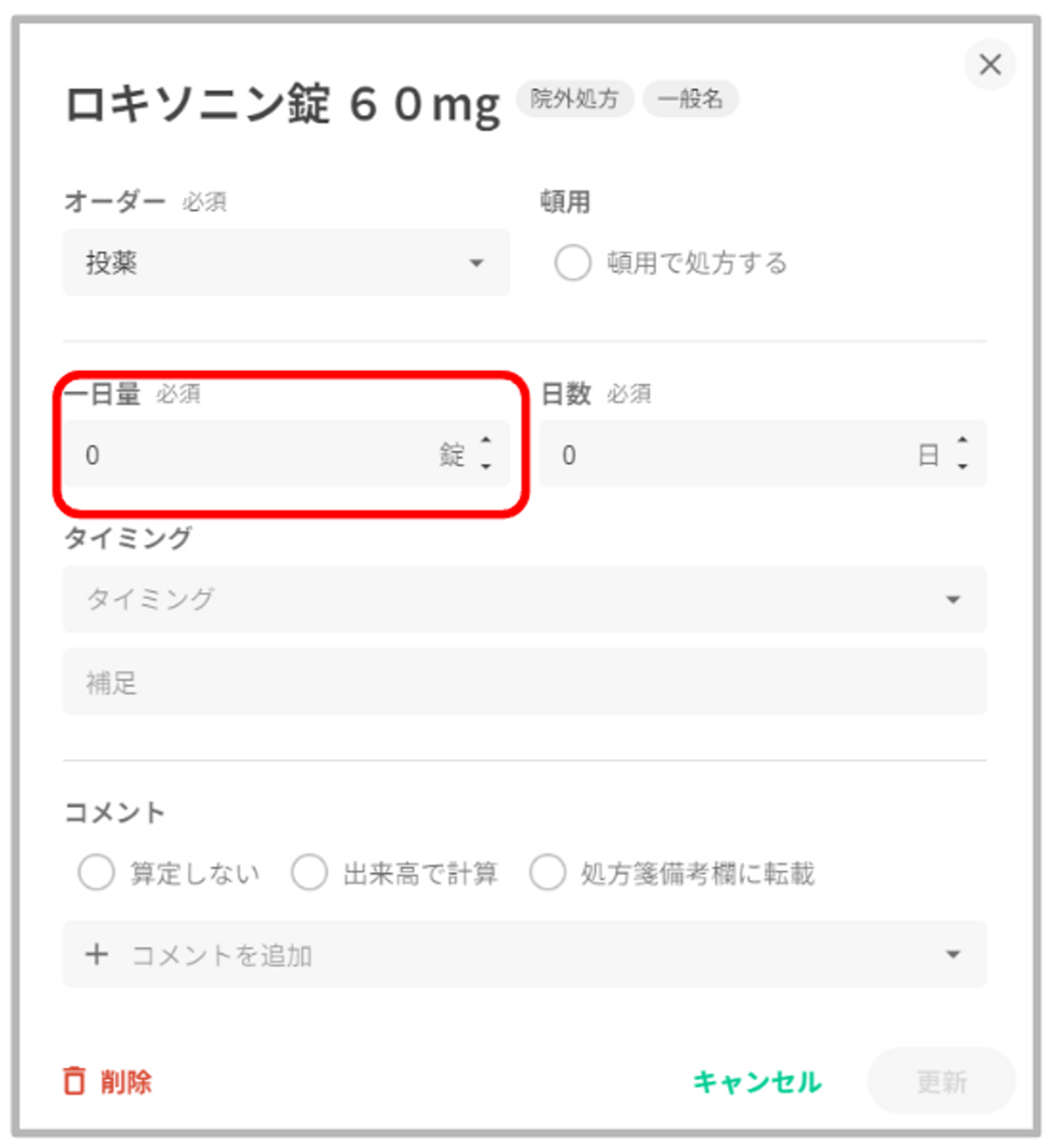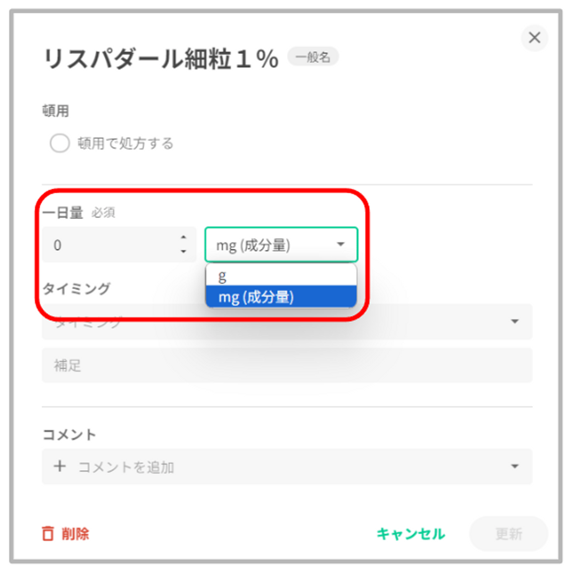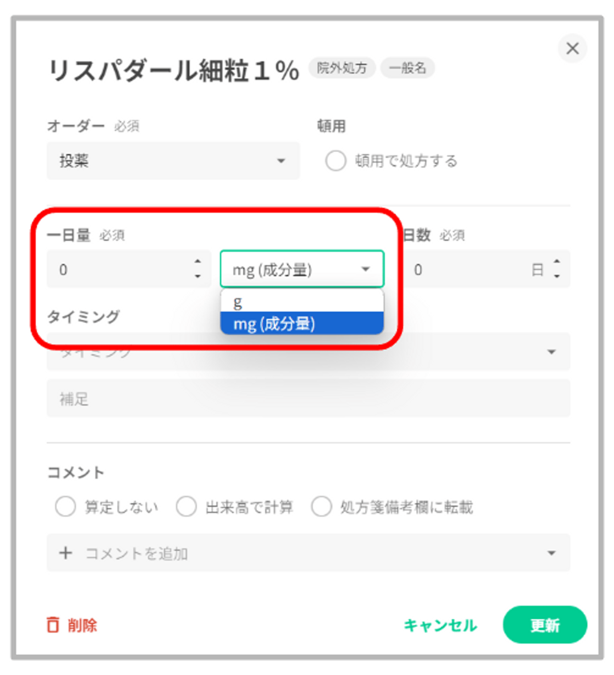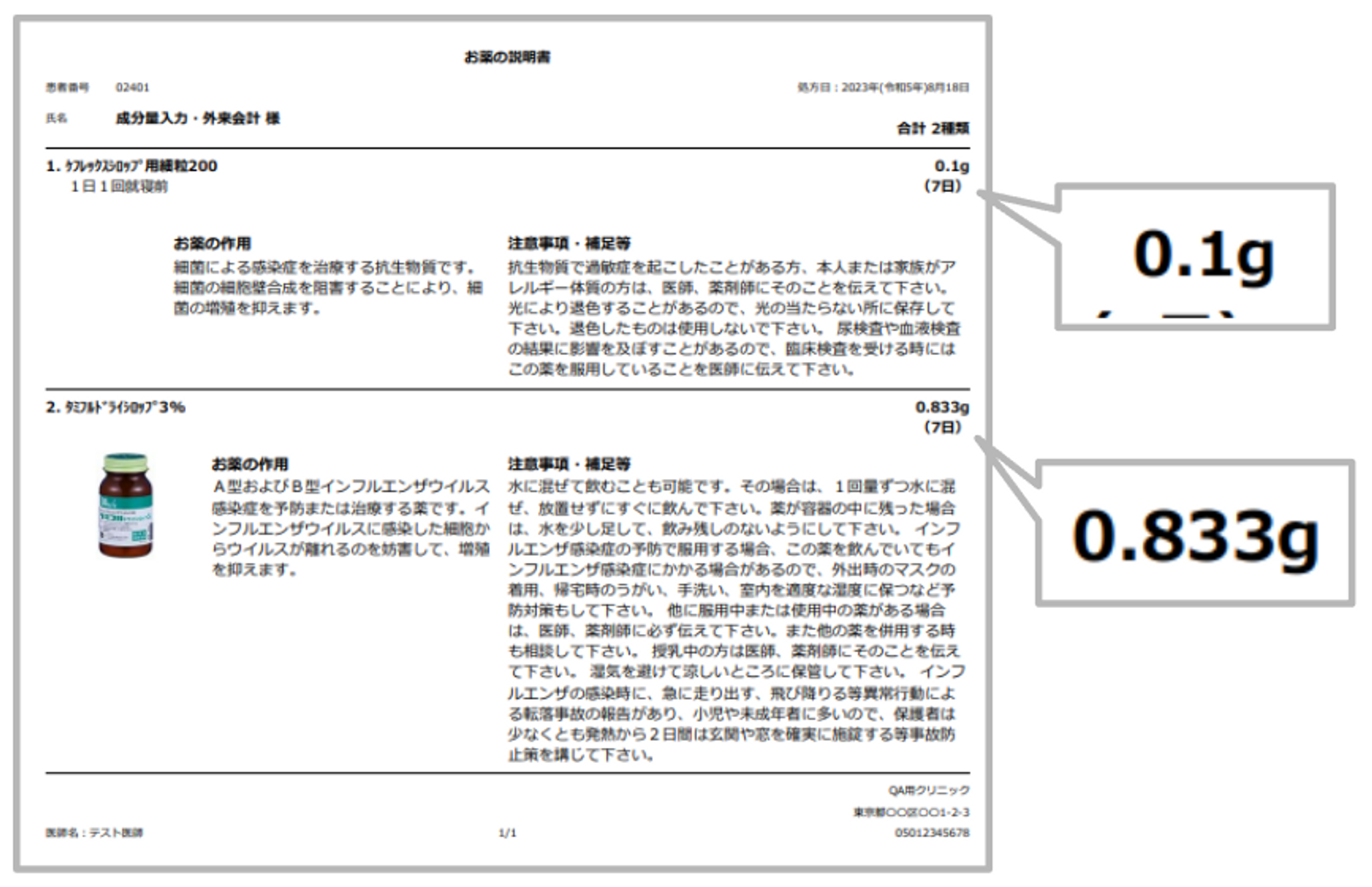 患者様の体格や病状にあわせて薬剤の用法を調整し処方できるよう、医薬品の成分量入力ができます。