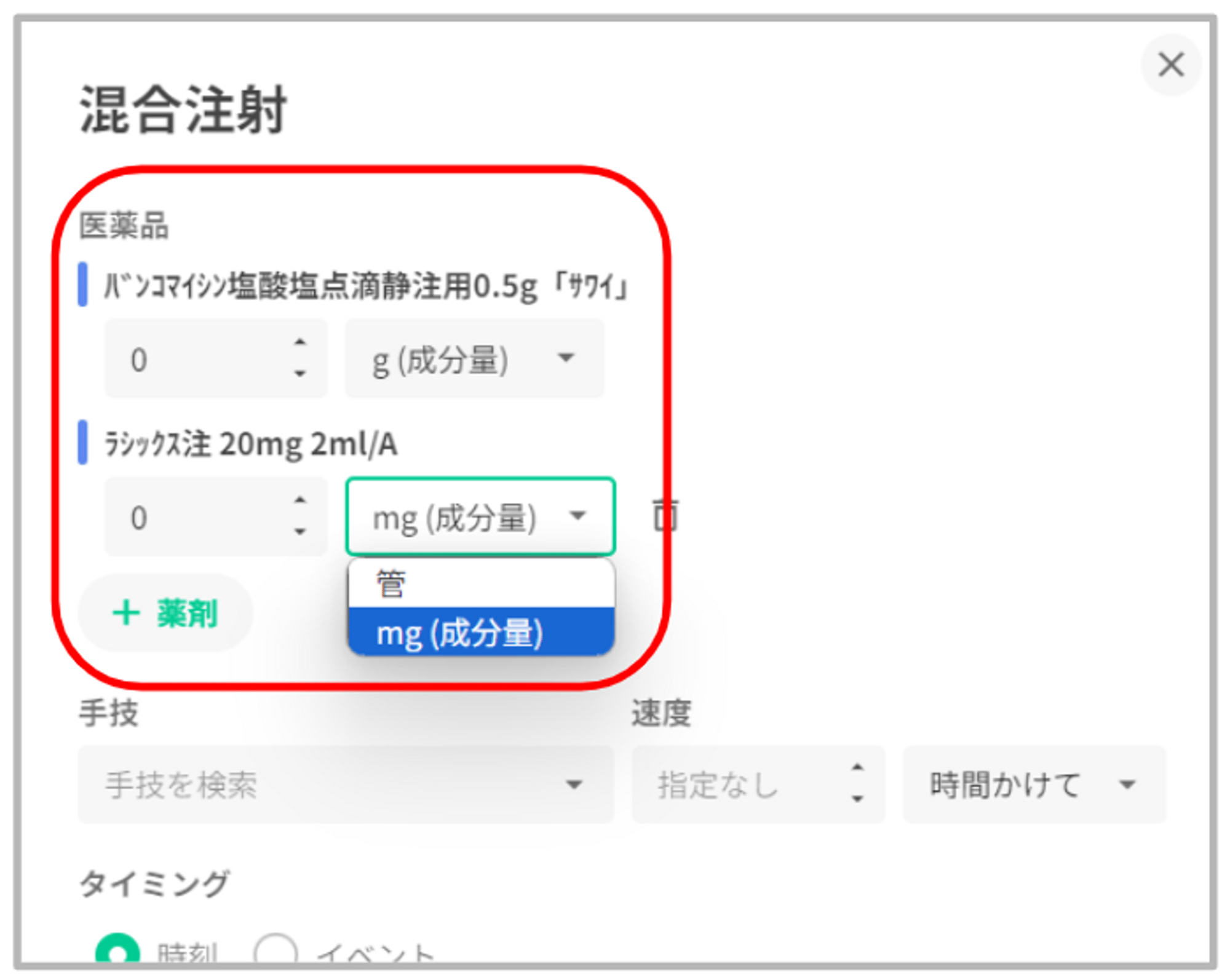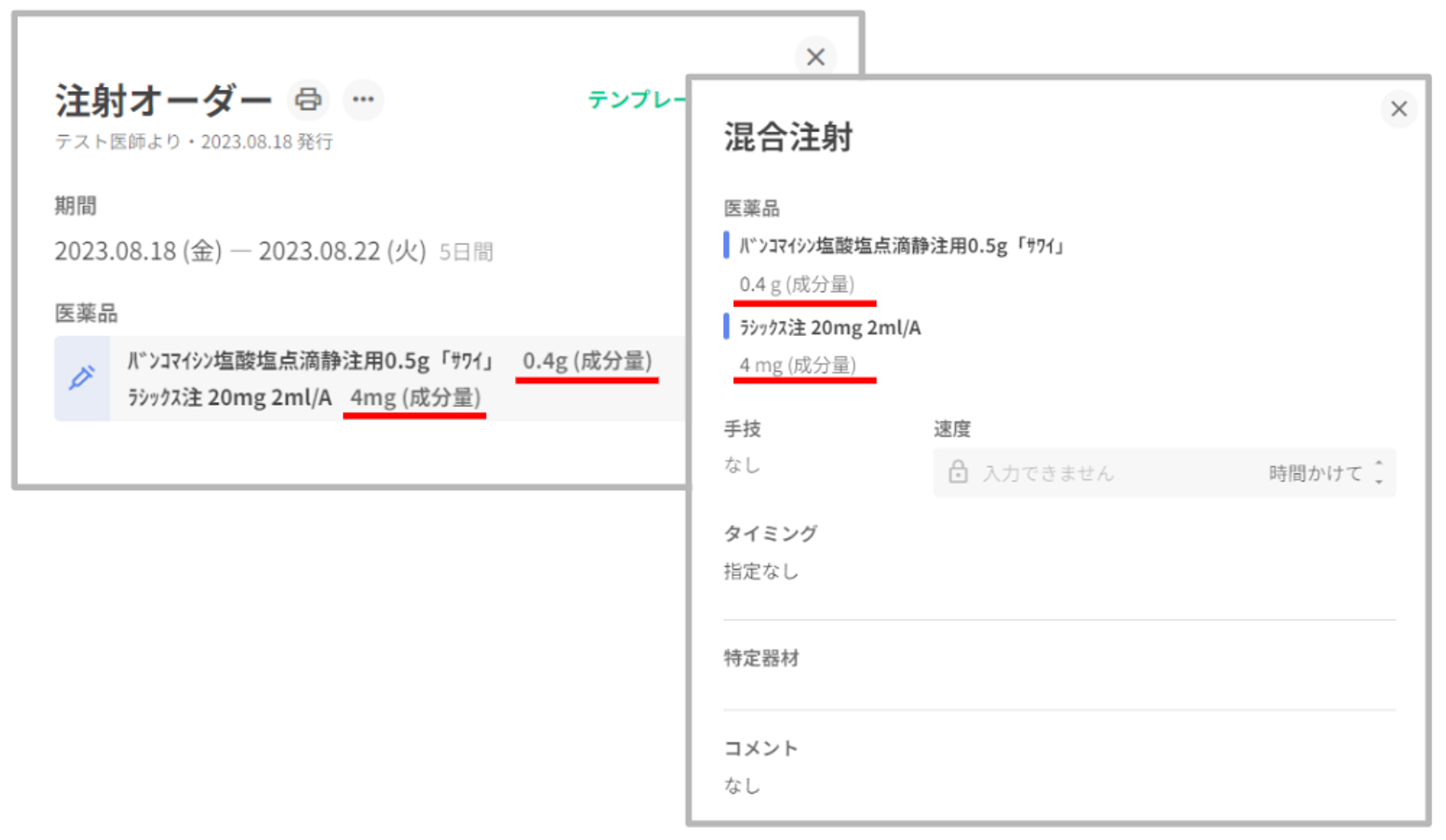 注射オーダーや自己注射オーダーで混合薬を入力する際も成分量入力をすることが可能です。