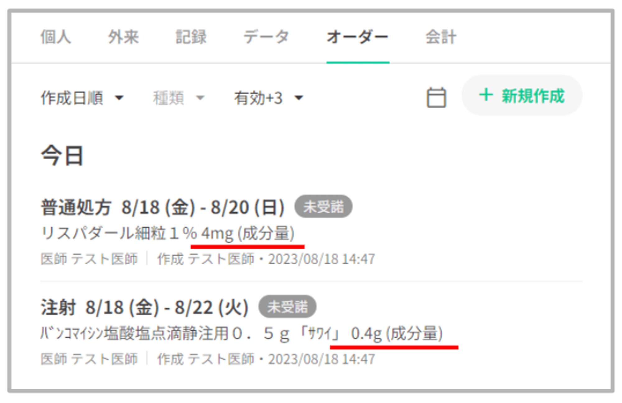 成分量入力で作成したオーダーは、オーダー一覧や詳細内容確認画面でも成分量で表示いたします。成分量単位の末尾には「(成分量)」と表示いたします。 オーダー一覧