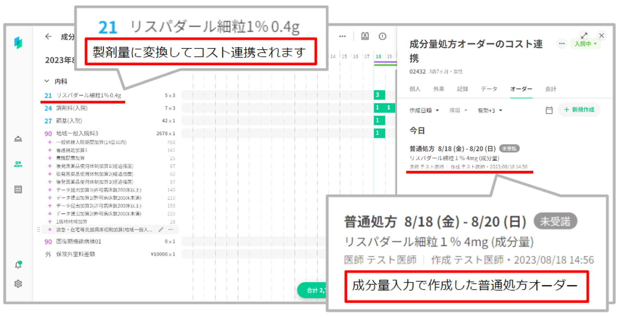 コスカレは成分量入力に対応していませんが、成分量入力で作成した投薬オーダーをコスト連携する際に製剤量に変換して反映いたします。