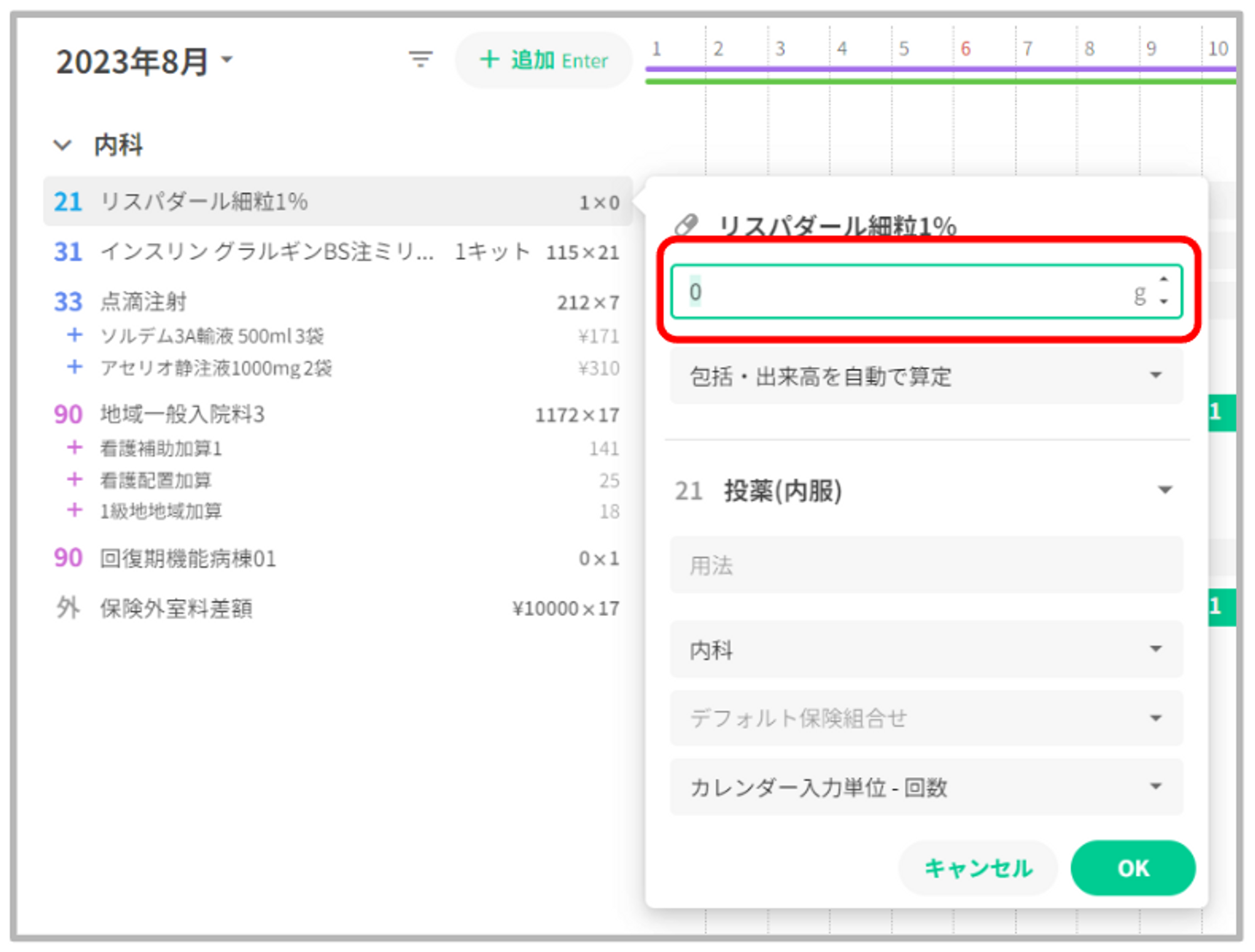 成分量設定のある医薬品を追加した際のデフォルト単位は「成分量単位」が選択されており、コストブロックに「成分量」と記載されます。