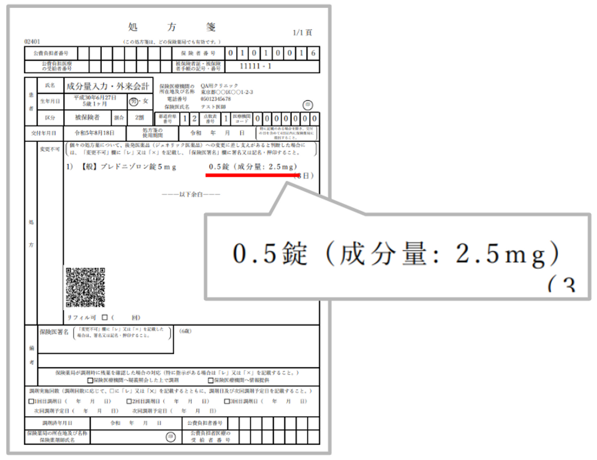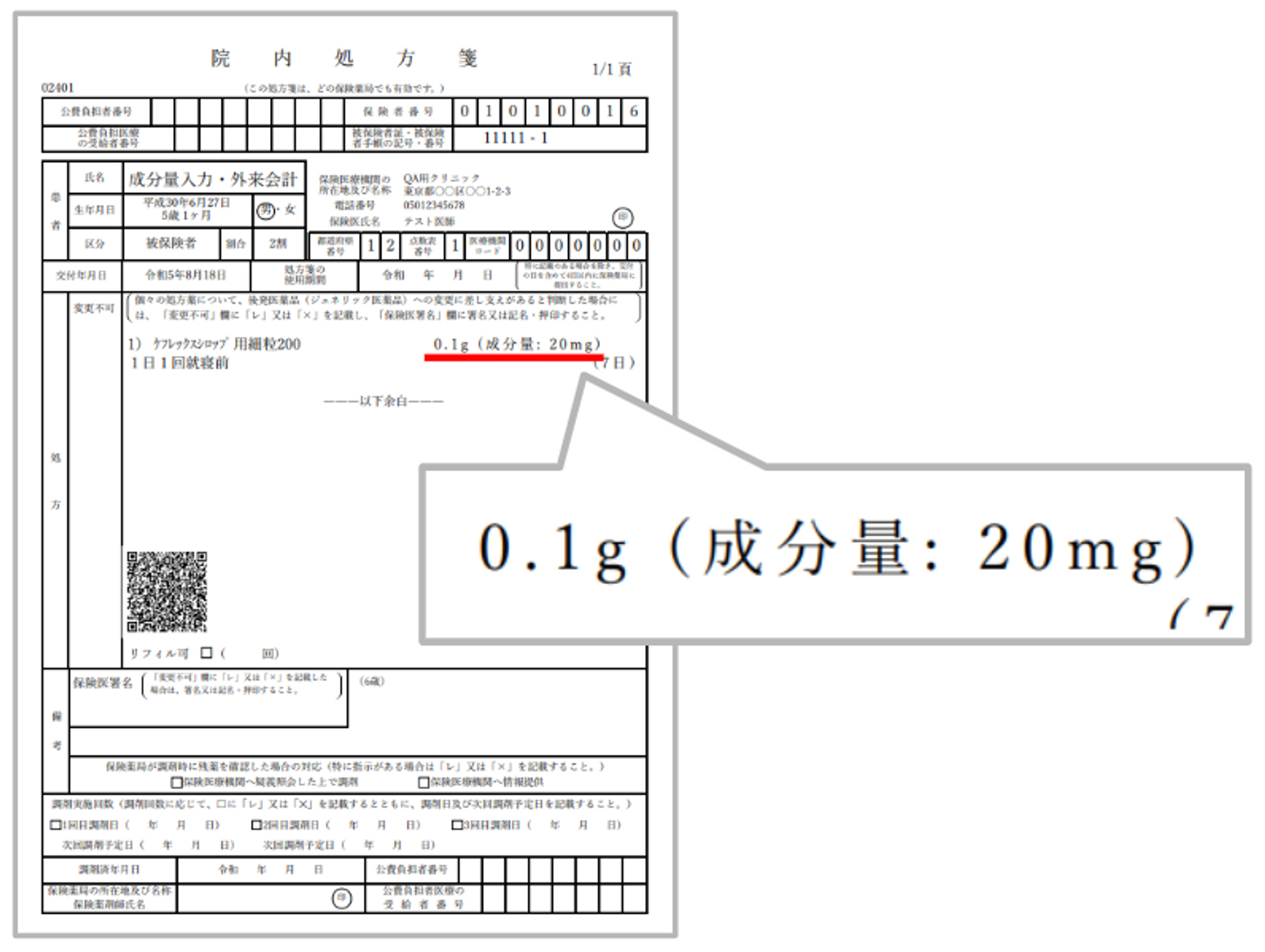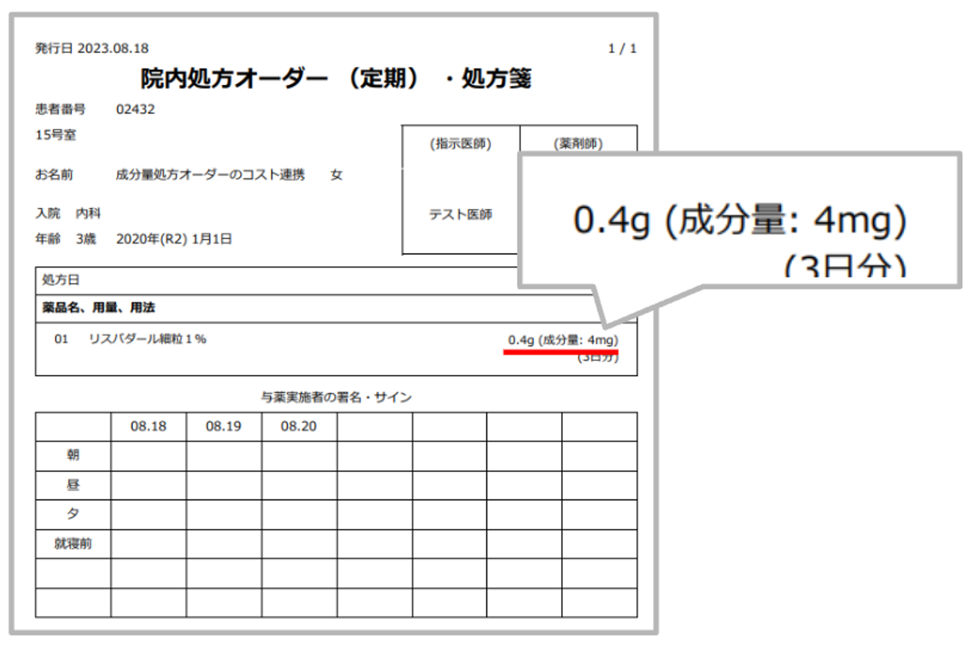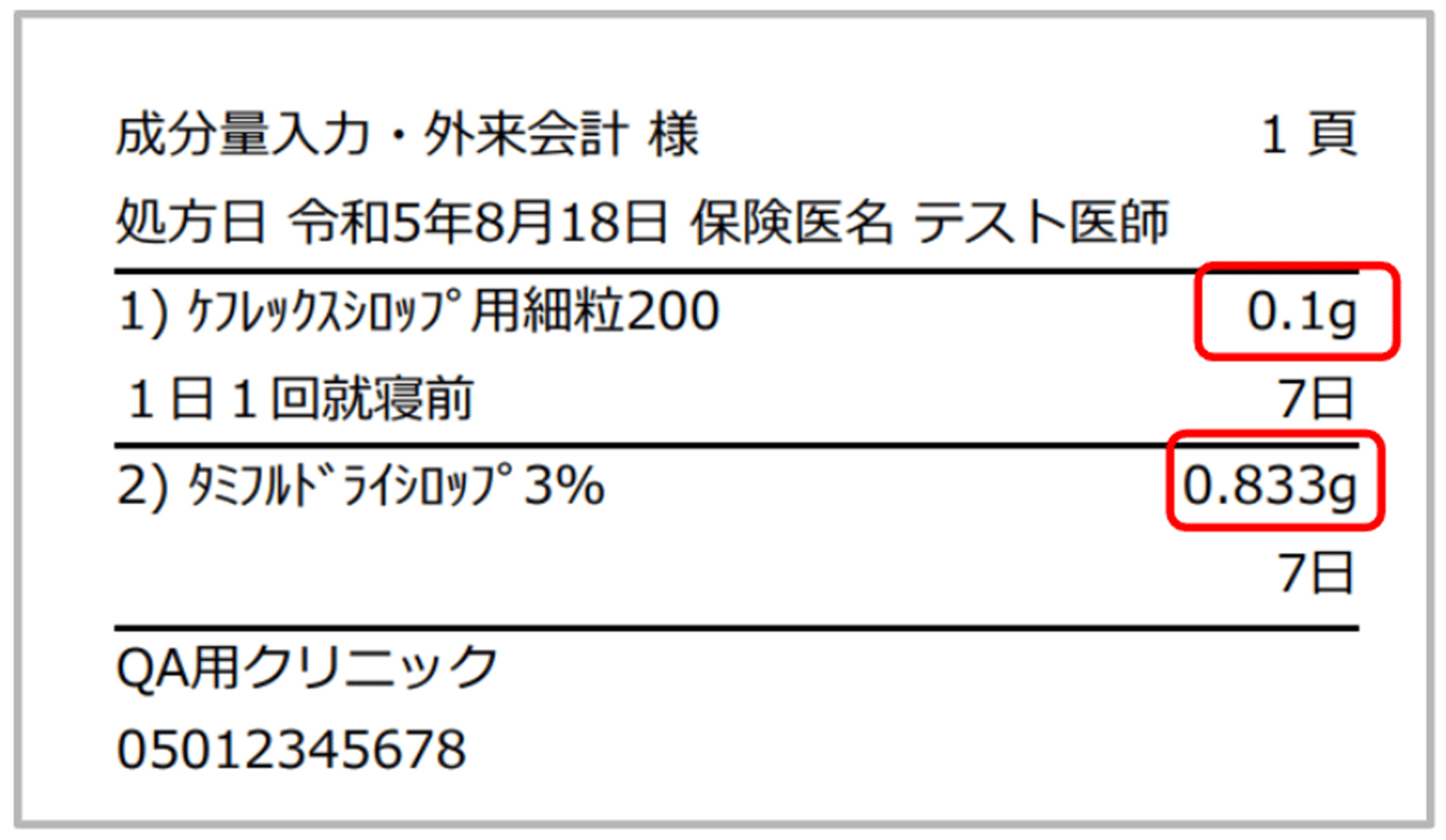 医薬品を成分量で入力した場合、投薬オーダーの指示箋・処方せんには製剤量と成分量の両方を印字いたします。製剤量に続いて成分量を表示いたします。 院内処方オーダー・処方箋