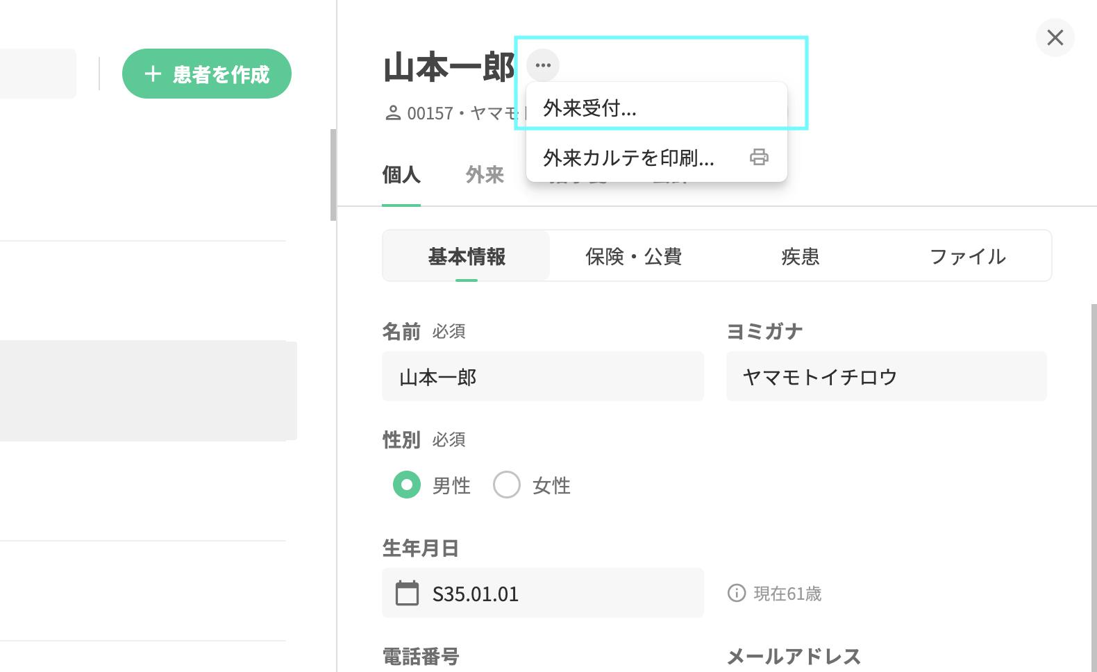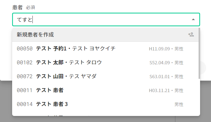 必要項目をすべて入力して「作成」ボタンを押下します。患者が新規登録されます。
