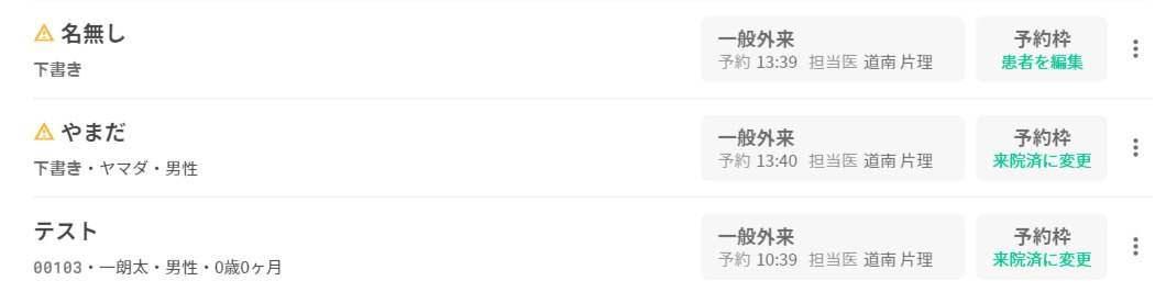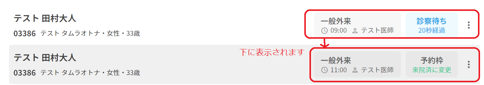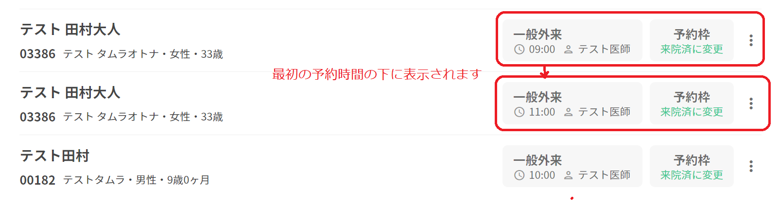 来院時間⇨予約時間の優先順位にて表示されます。 既に同じ患者の受付をしている場合、最初の予約時間の下段に並びます。