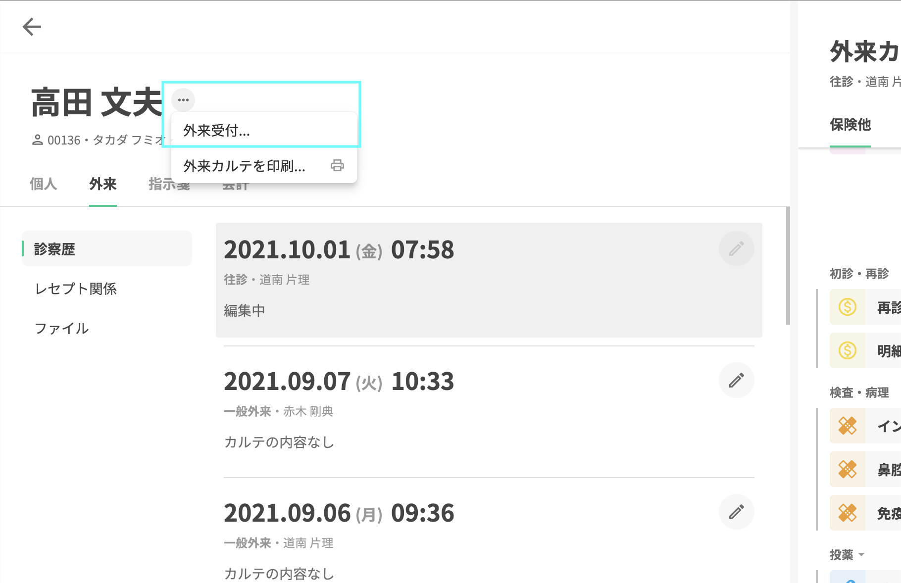 患者の名前の横・・・ > 外来受付を作成 より予約を追加することができます。