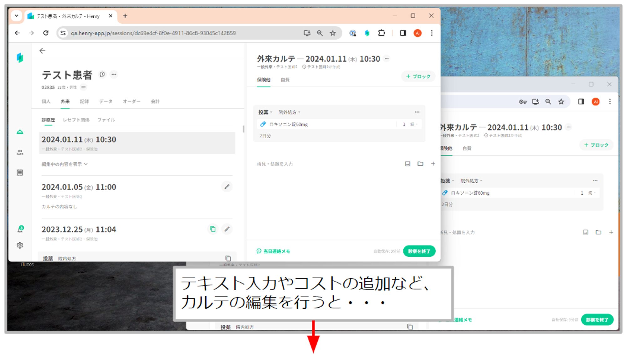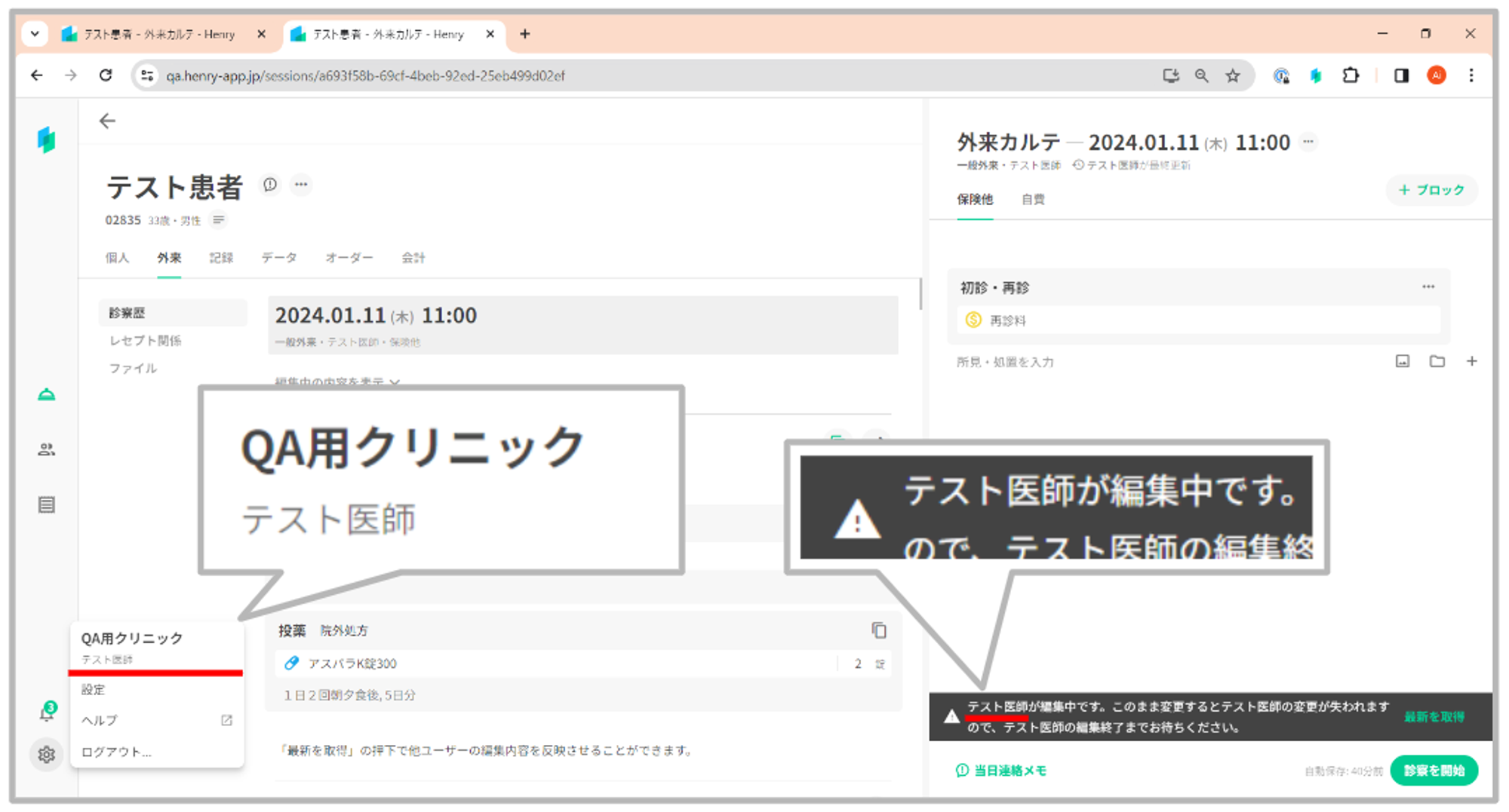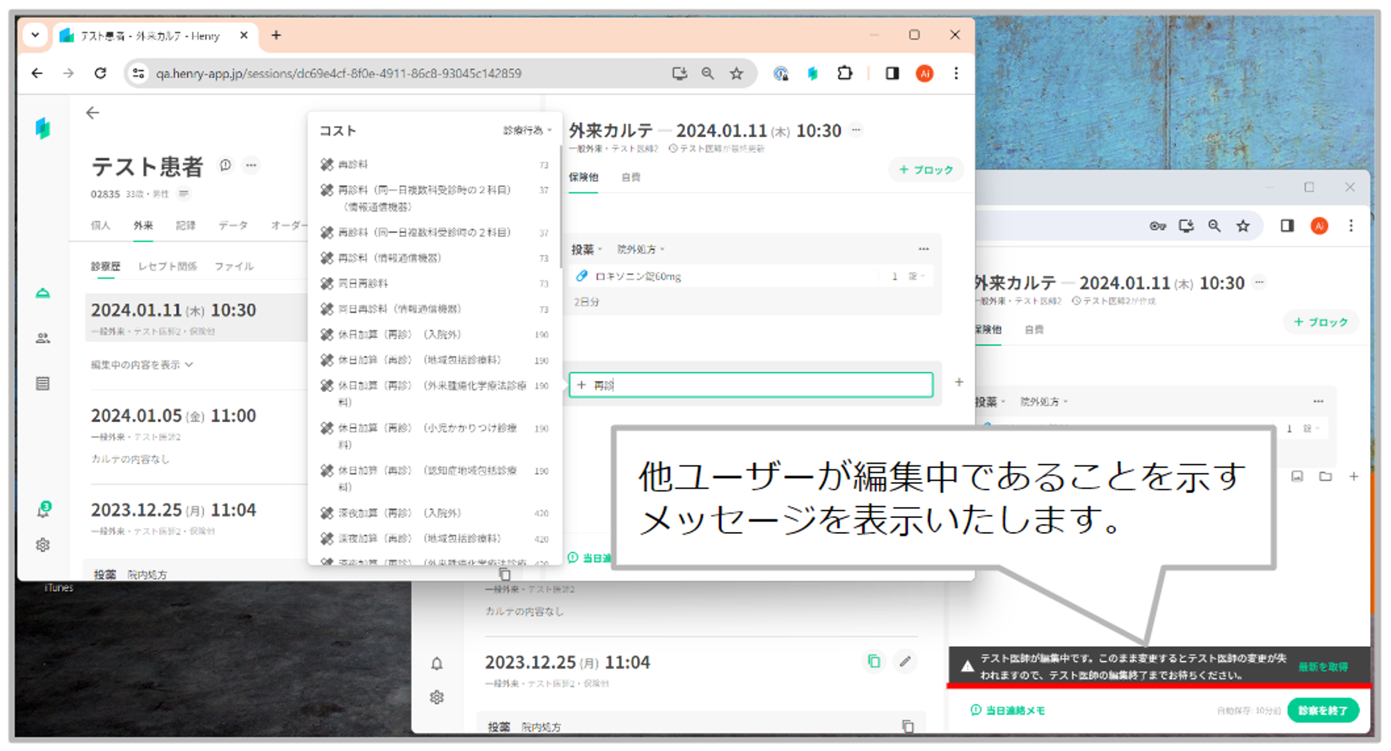 同じPC内で2つの画面を表示した場合や、別のPCで同じ患者のカルテを開くなど、同一ユーザーが複数画面を開いた場合も2つ目以降の画面において、自分自身が編集中であることを示すメッセージを表示いたします。